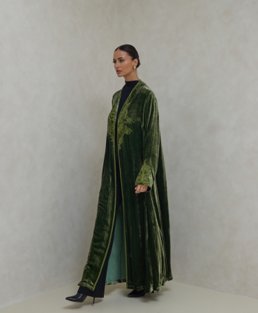 BHD 135.000A sophisticated abaya made from high-quality velvet with a soft, luxurious texture, combining elegance and comfort in one design. The centerpiece features modern Moroccan hand embroidery in the shape of tree leaves, carefully crafted by skilled artisans, adding a unique and artistic touch to the garment. عباية راقية مصنوعة من المخمل عالي الجودة بملمس ناعم وفاخر، تتميز بتصميم أنيق يجمع…