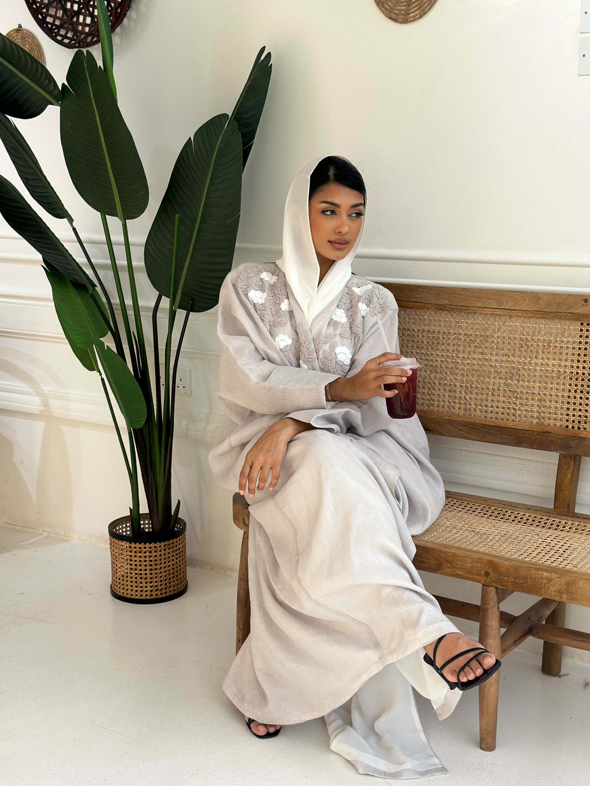 BHD 130.000stylish and trendy with grey linen abaya with hand work details.