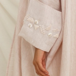 BHD 100.000Pearl abaya with white and Pearl colors needle work on the sleeves end, the scarf color is off white