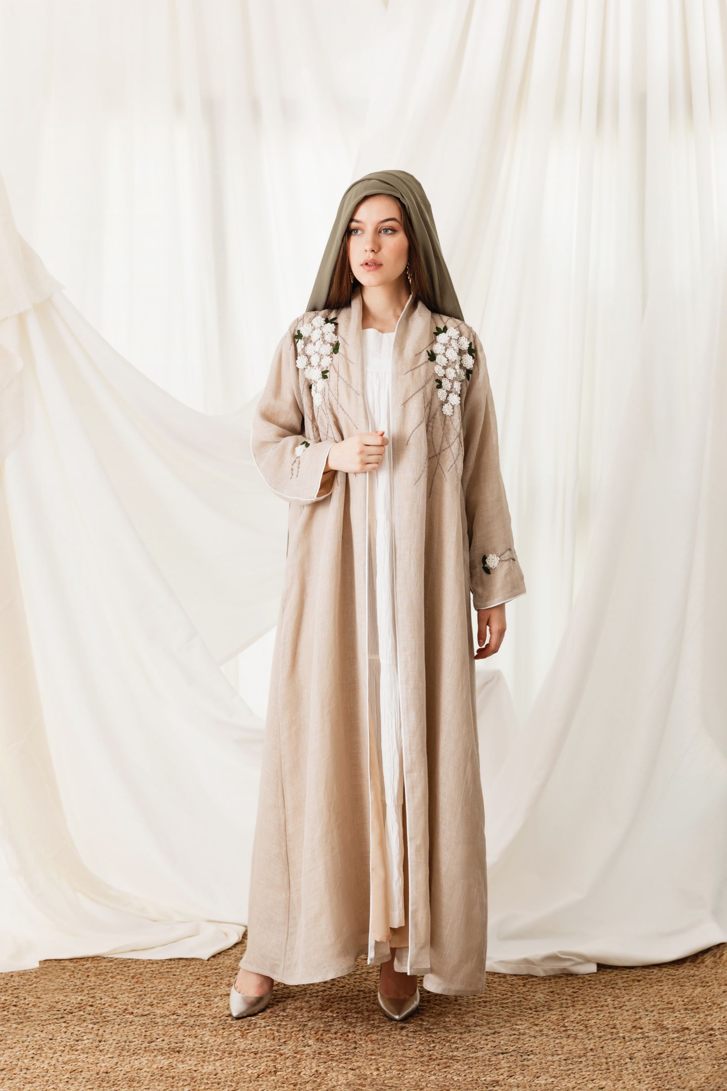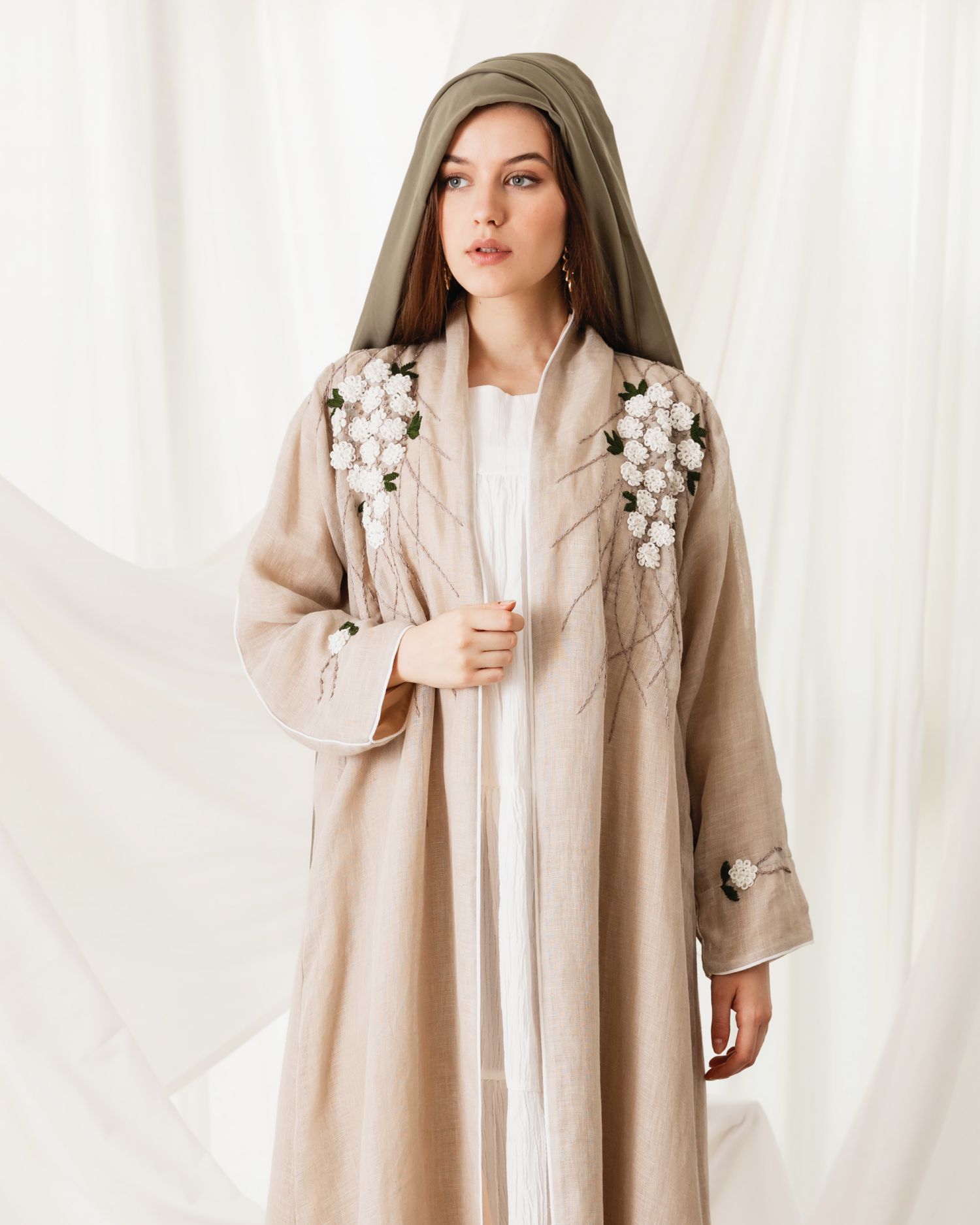classy and elegant with beige linen abaya with hand work details.