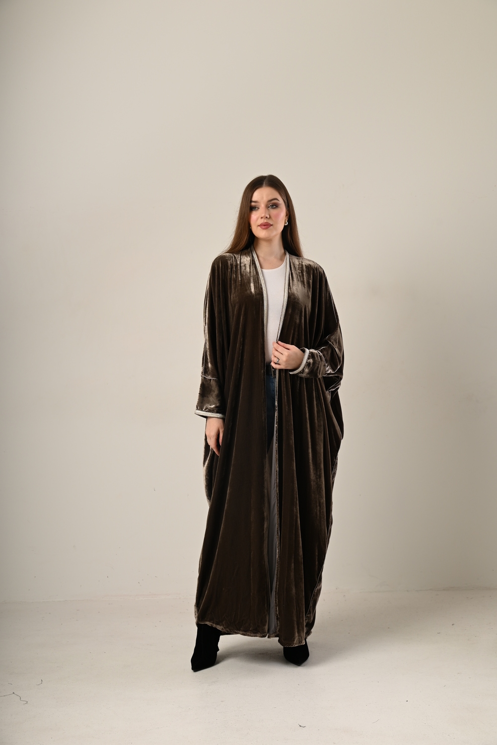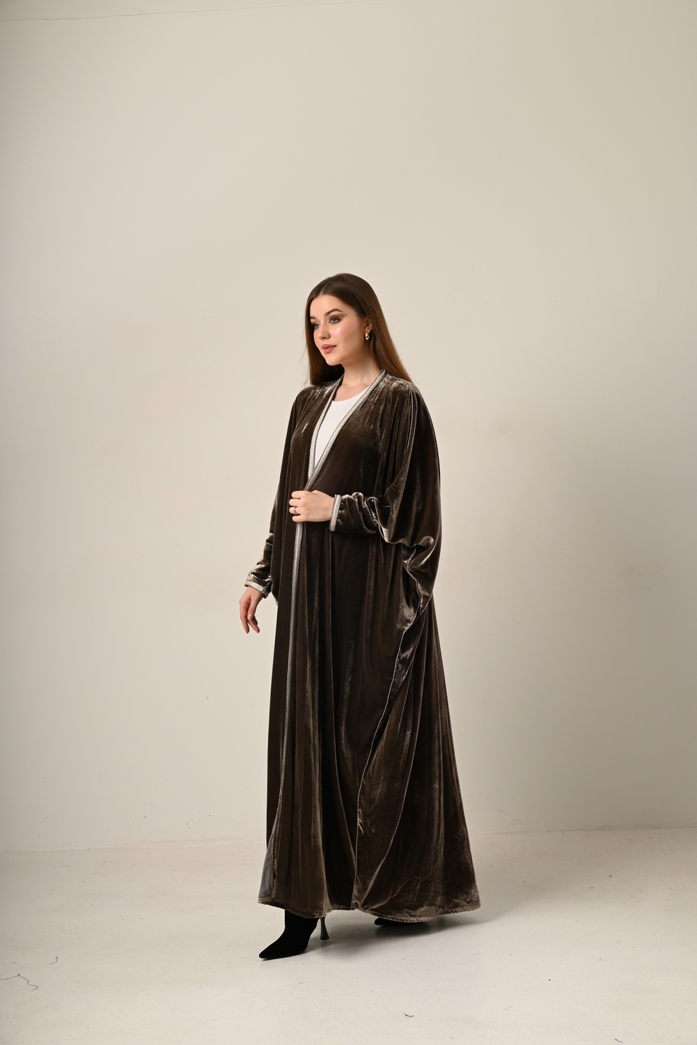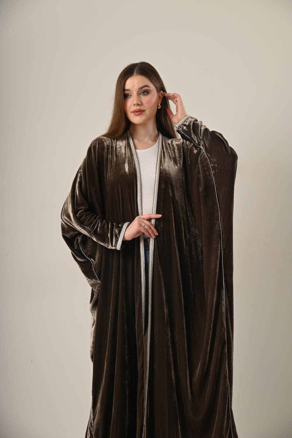 BHD 90.000Abaya of warm Italian velvet fabric made of luxurious silk threads – wide and open design, with narrow sleeves, elegant in wear that expresses your elegance. Comes with a headscarf