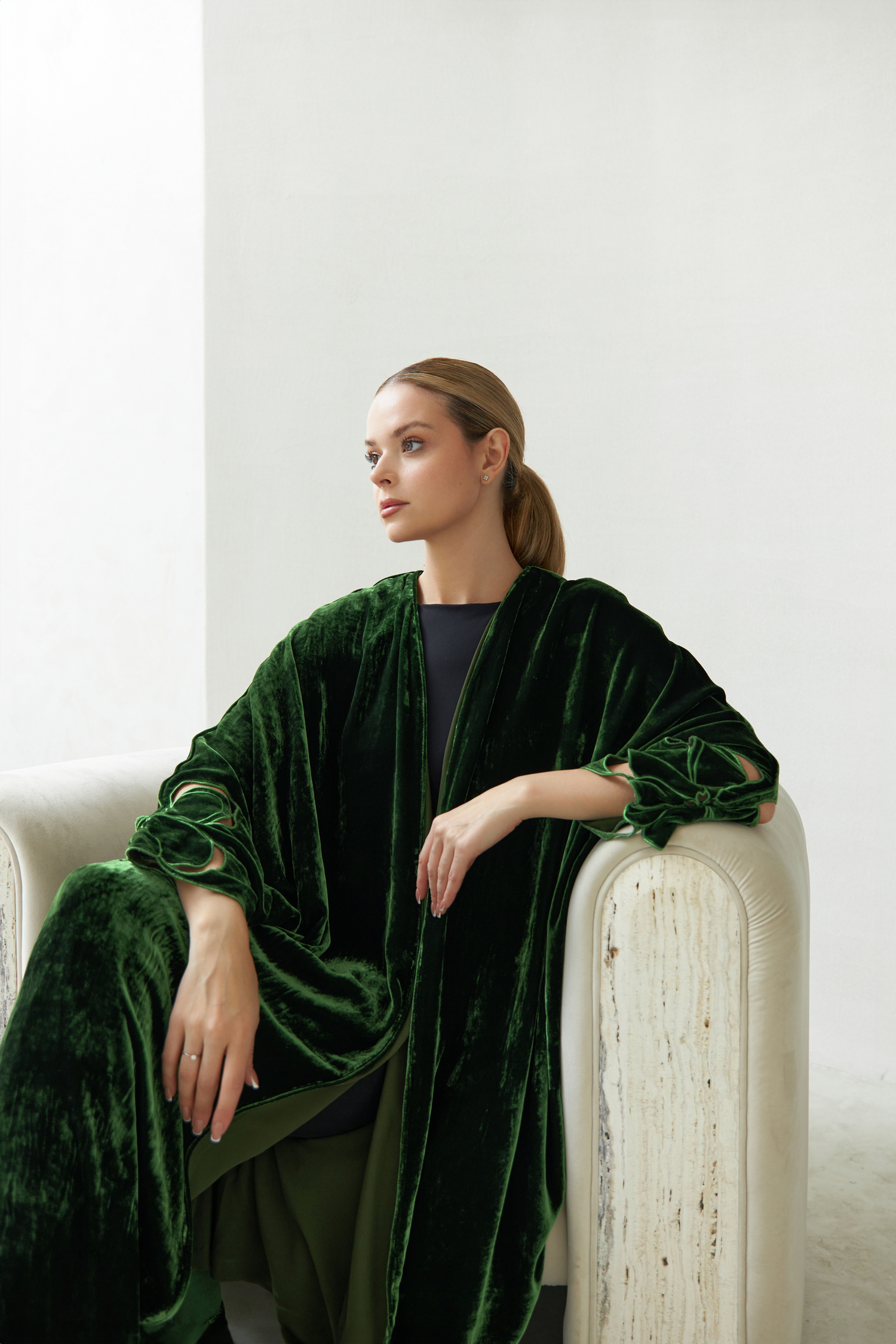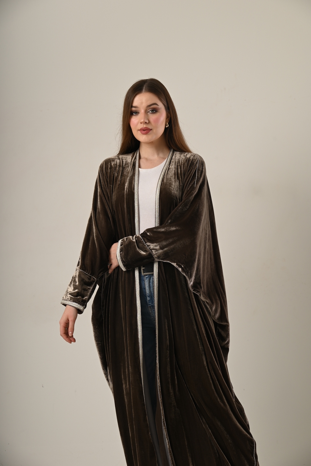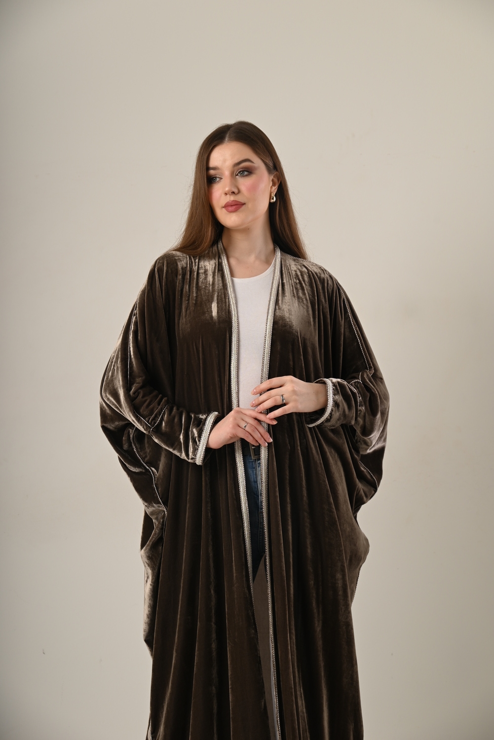 BHD 90.000Abaya of warm Italian velvet fabric made of luxurious silk threads – wide and open design, with narrow sleeves, elegant in wear that expresses your elegance. Comes with a headscarf