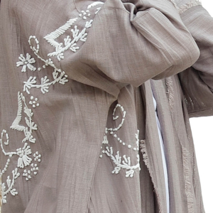 Crushed Cotton Light Violet Abaya With Machine Embroidery Details Over The Shoulders Till Waist