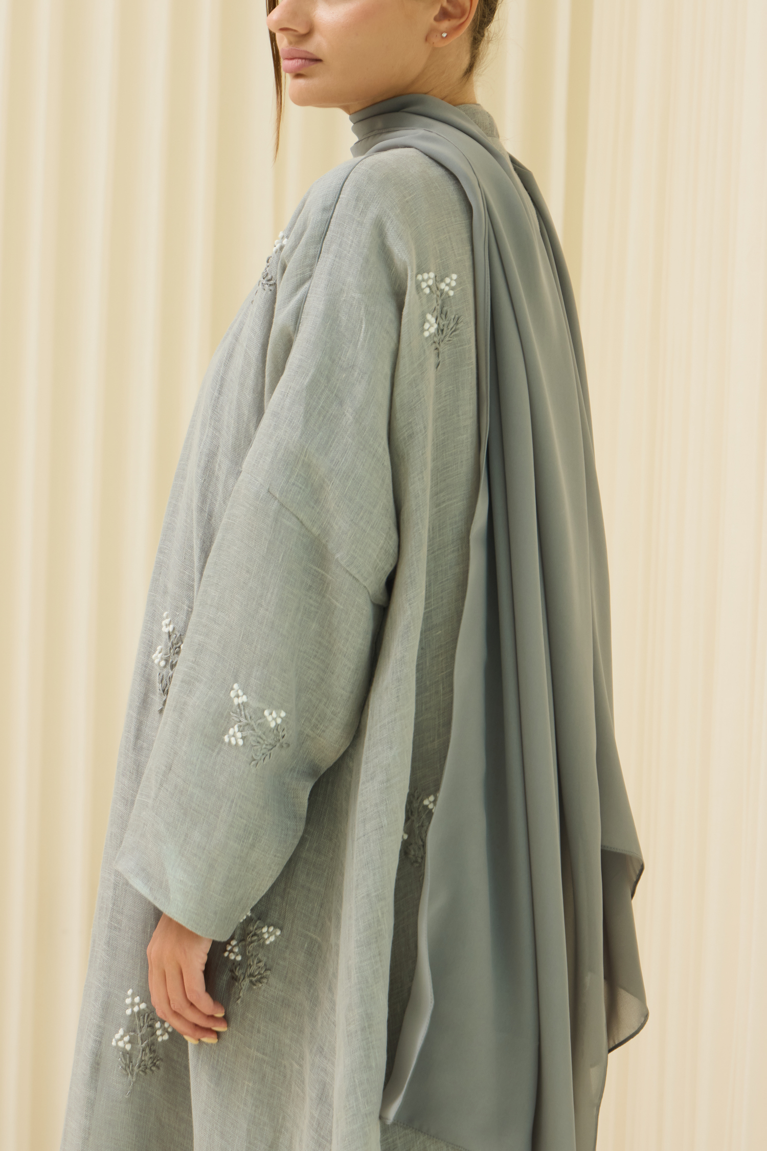 BHD 130.000Trendy and cool in dark grey linen abaya with handwork.