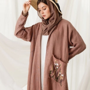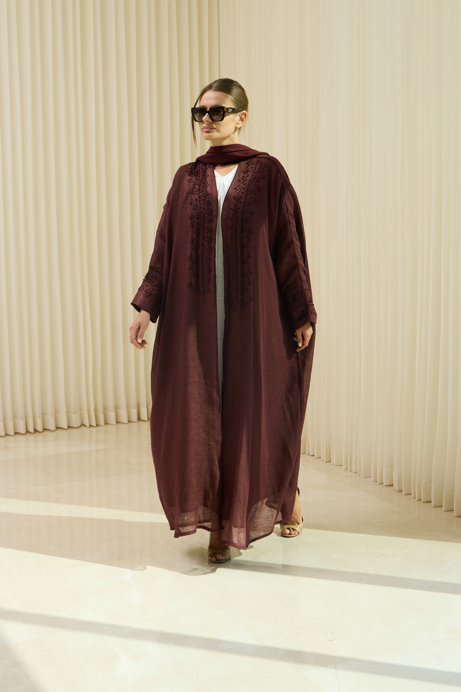BHD 130.000stylish and chic in peach brown linen abaya with embroidered pocket.