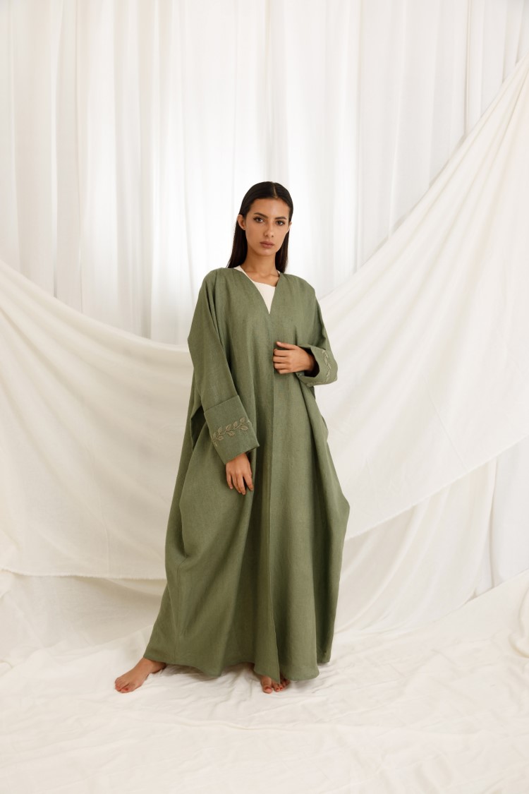Hazel Green abaya with needle work on the sleeves end, the scarf color is off green
