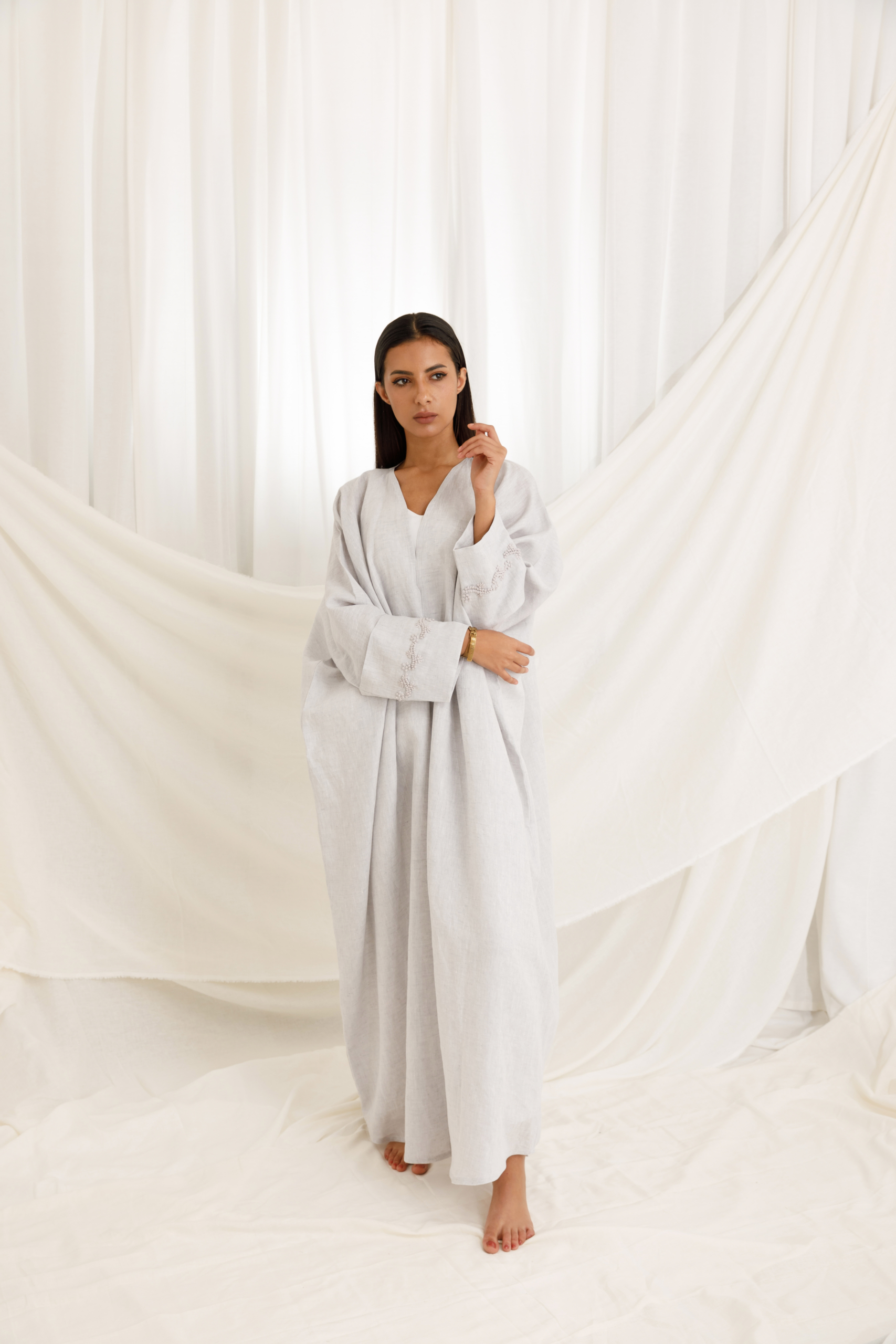BHD 130.000Dark grey linen abaya with yellow facing inside sleeves and floral embroidery details