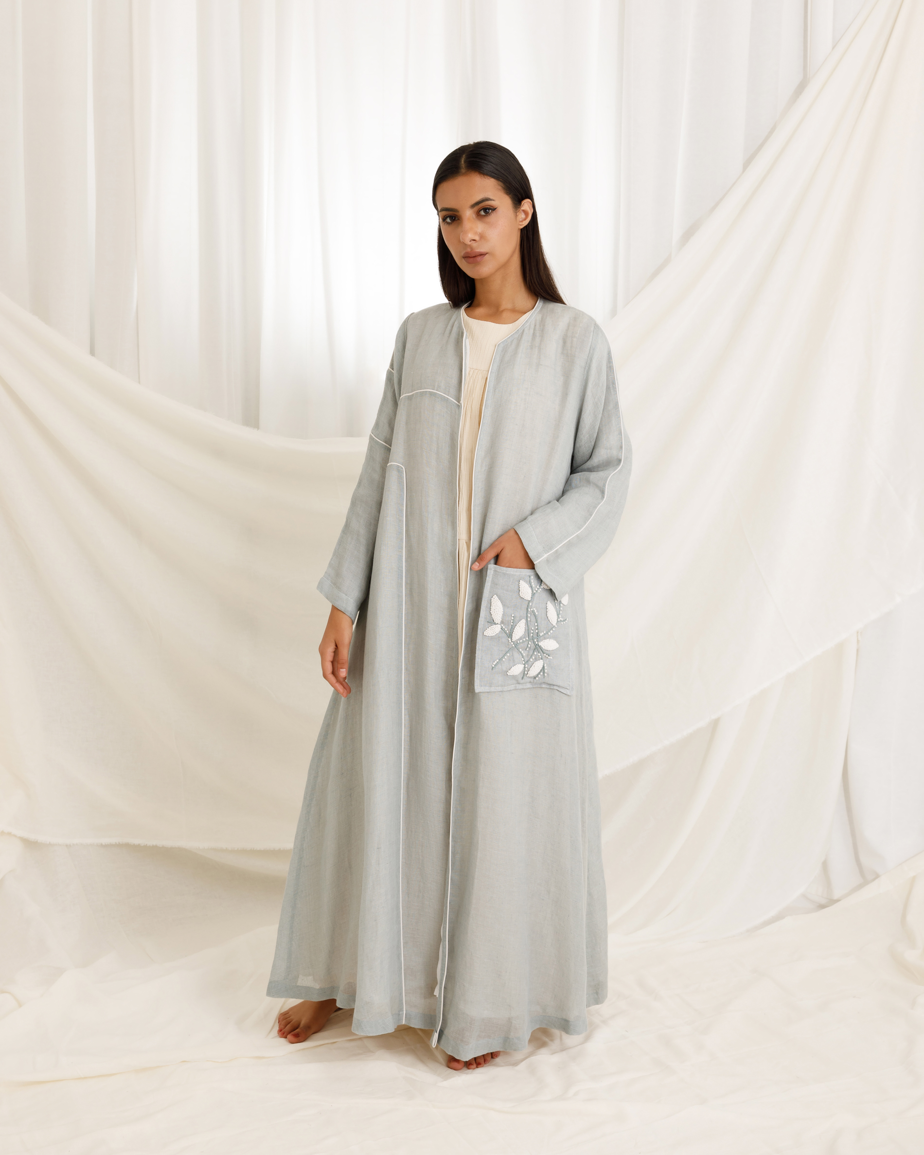 BHD 130.000cheeky and elegant with black linen embroidered abaya.