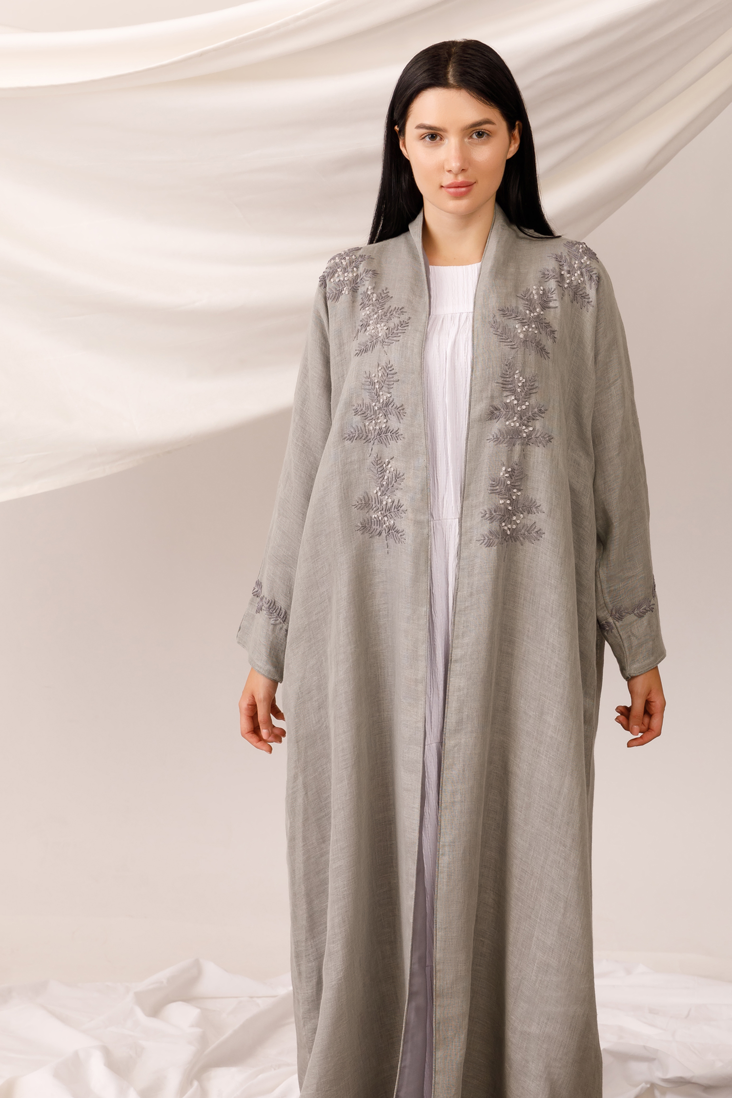 BHD 130.000stylish and trendy with grey linen abaya with hand work details.