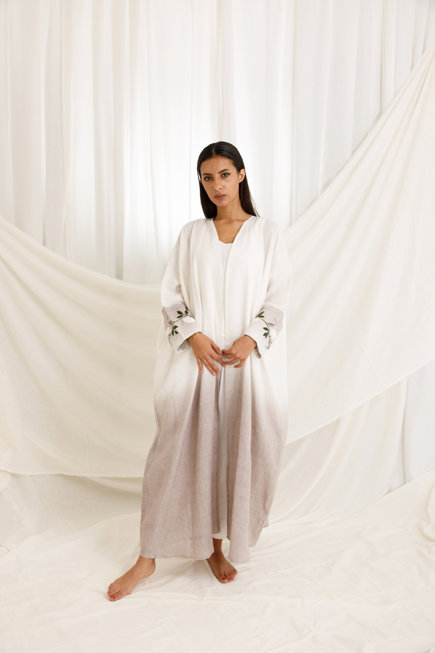 Achieve cool look with casual light ombre white and light shade of brown abaya with elegant hand work on the sleeves