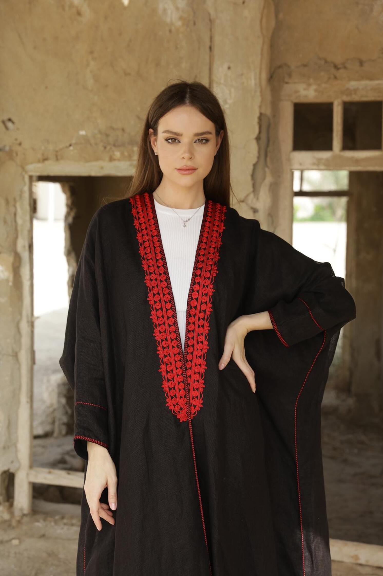 BHD 130.000olive green two tone linen abayas with braided details across the edges and sleeves and tassel details