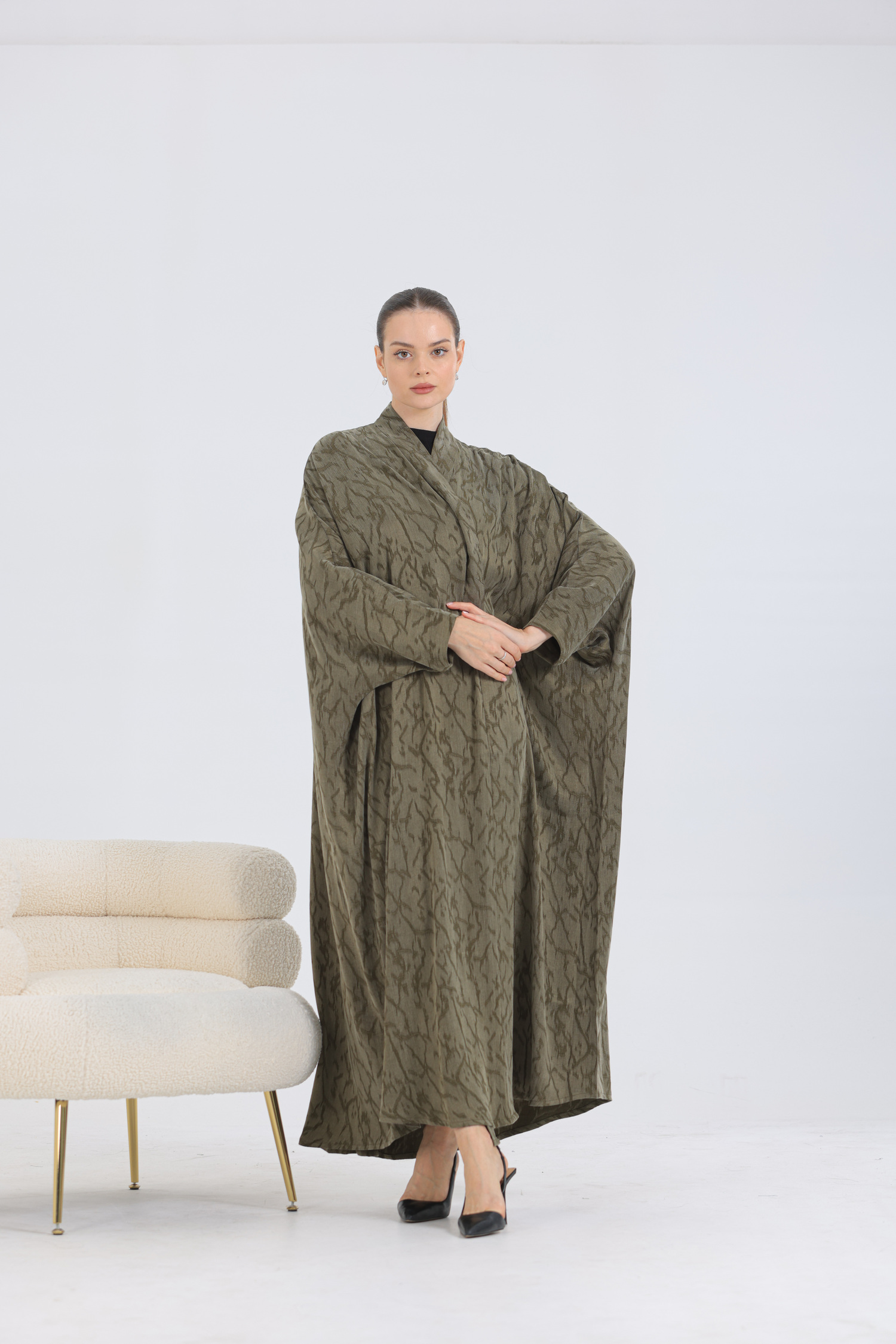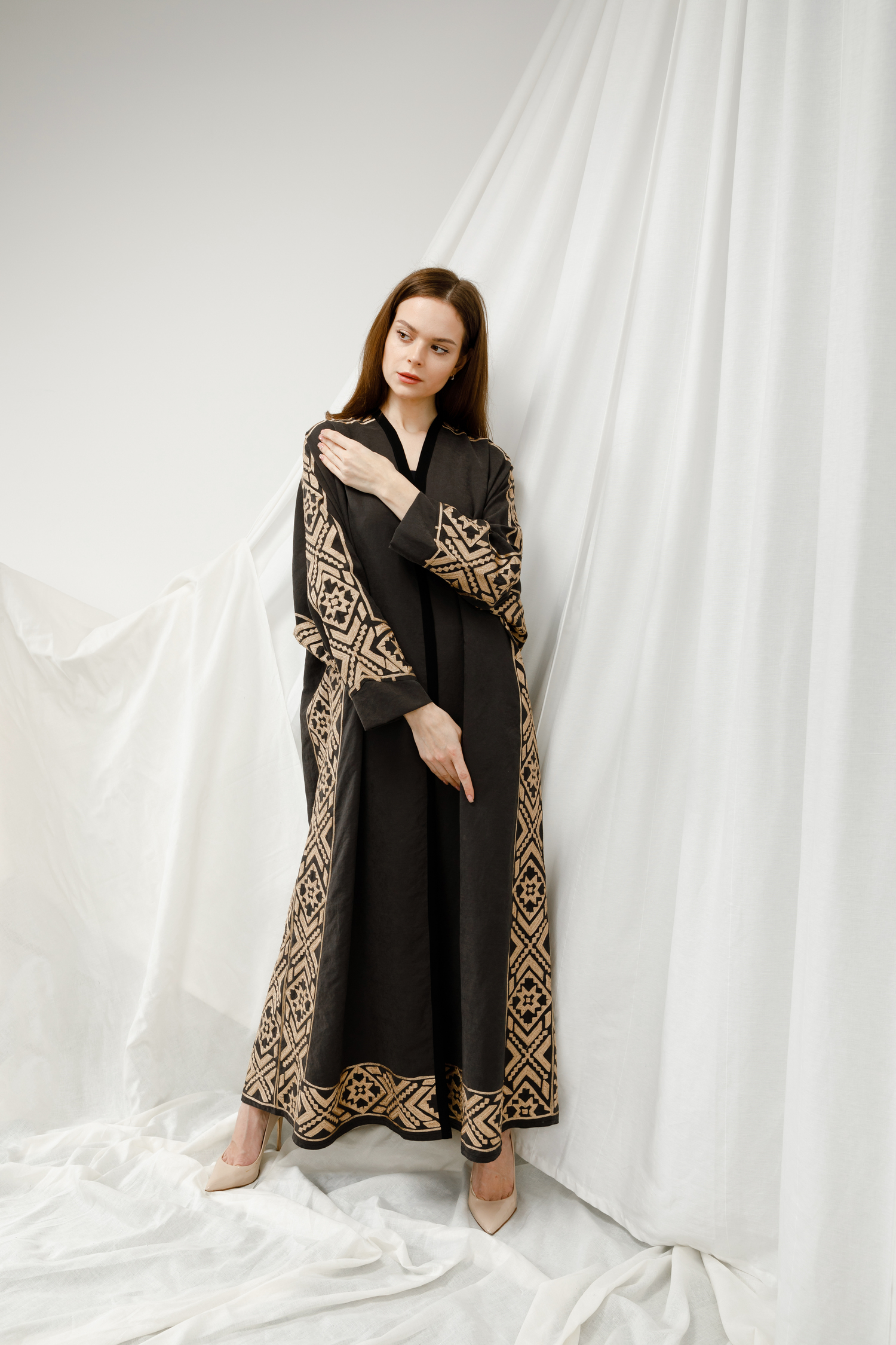 black wash silk abaya with light brown heavy machine embroidery details all over the sleeves ,sides and flare ends