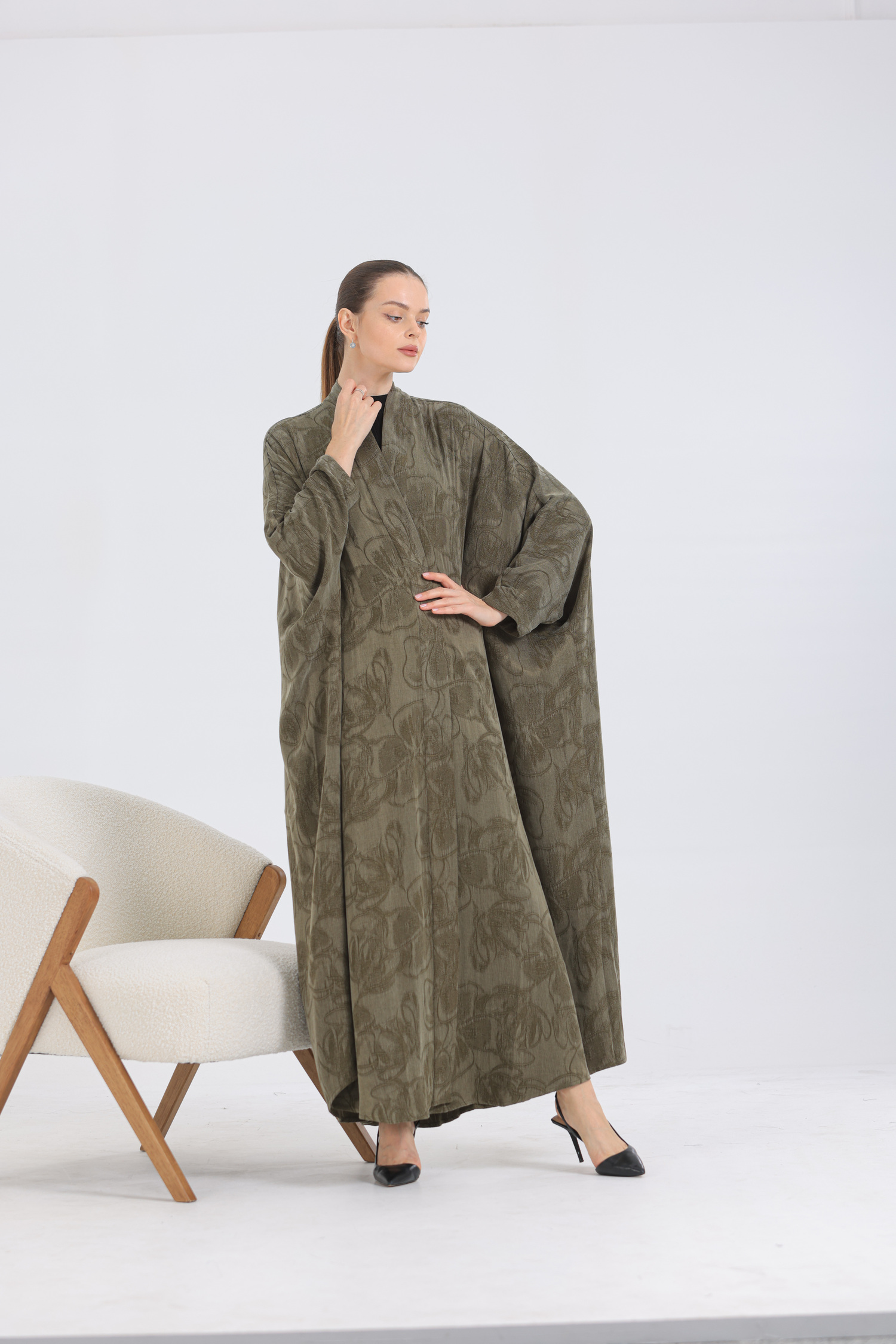BHD 130.000Dark grey linen abaya with yellow facing inside sleeves and floral embroidery details