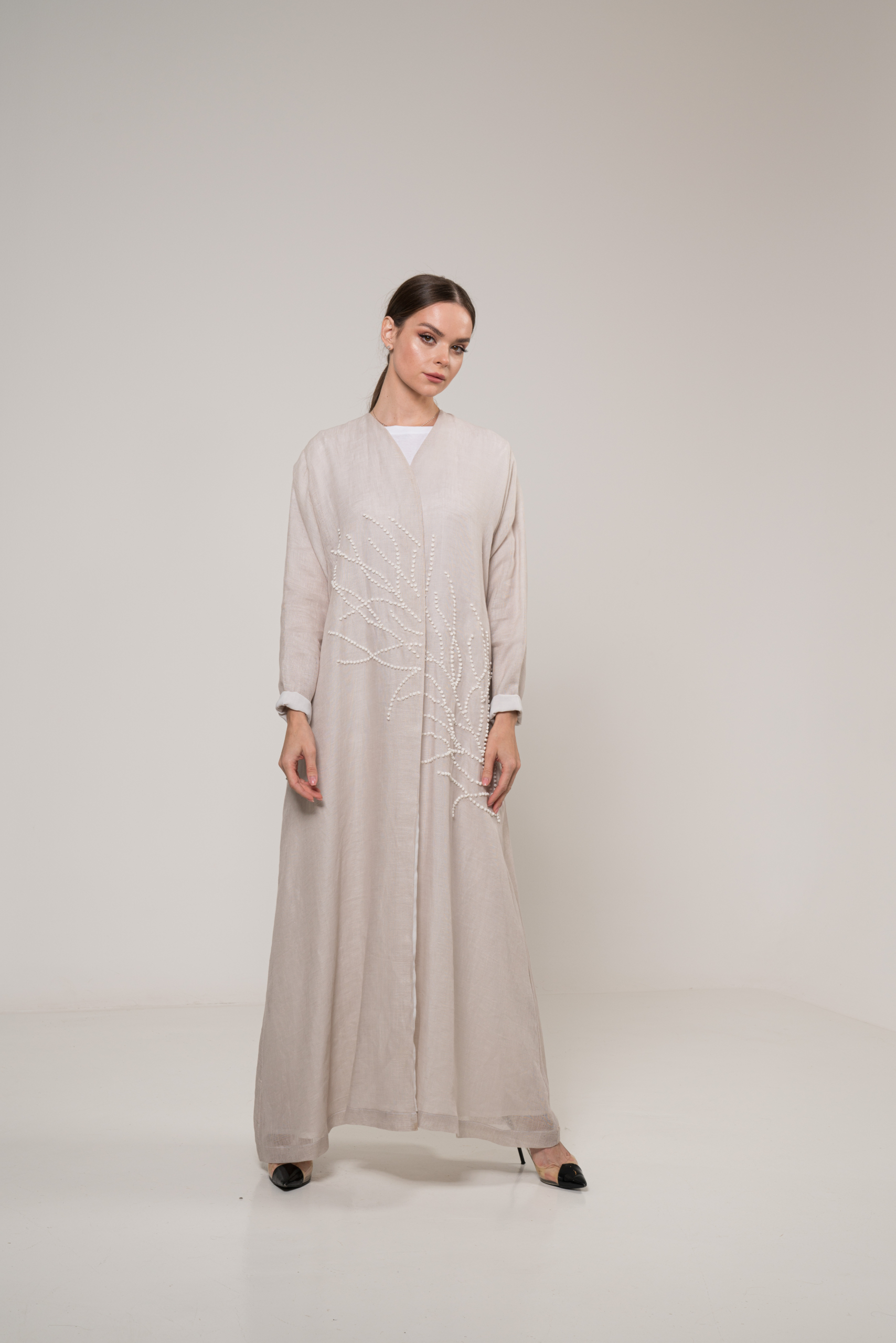 BHD 130.000Casual and cool with beige linen abaya with statement handwork