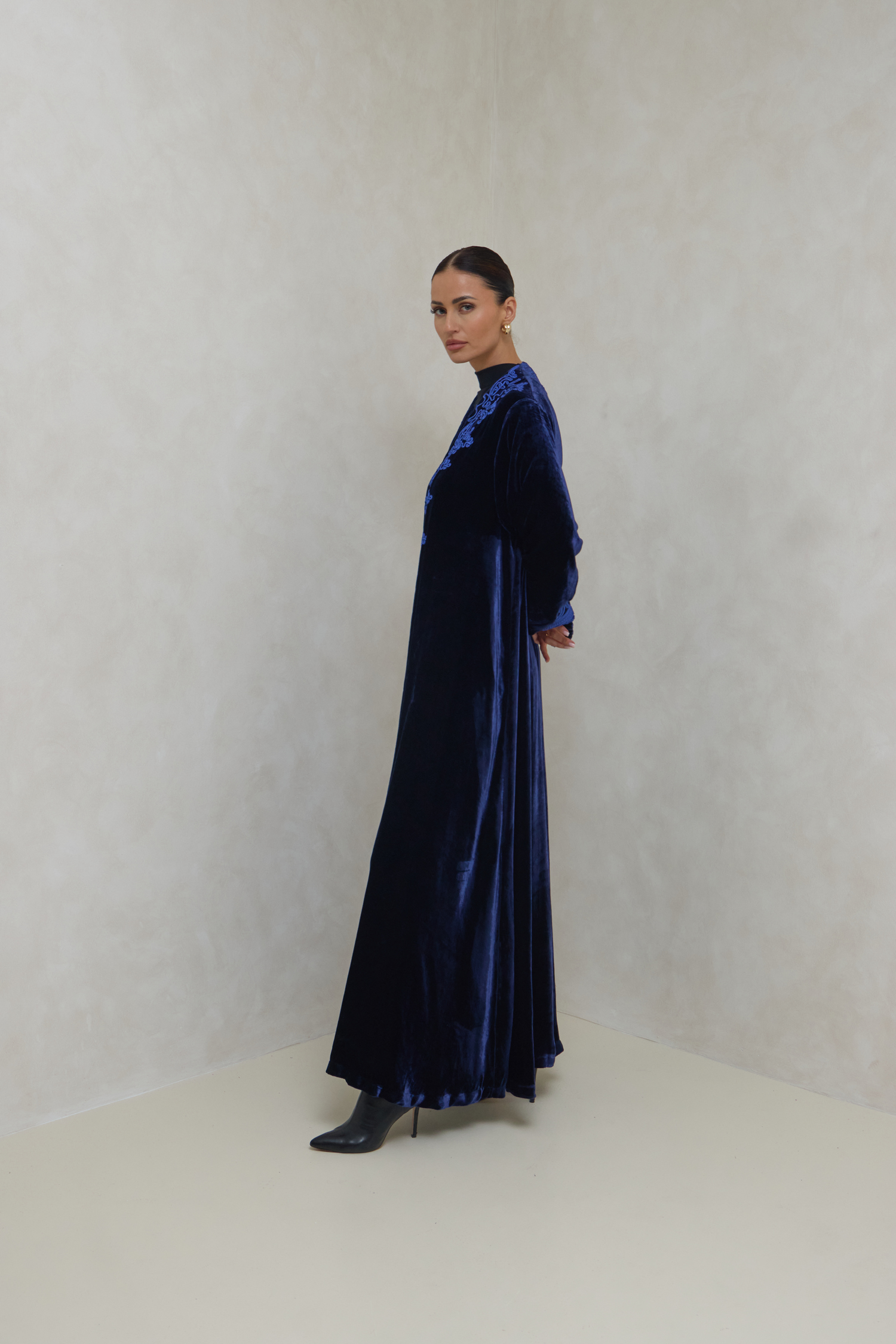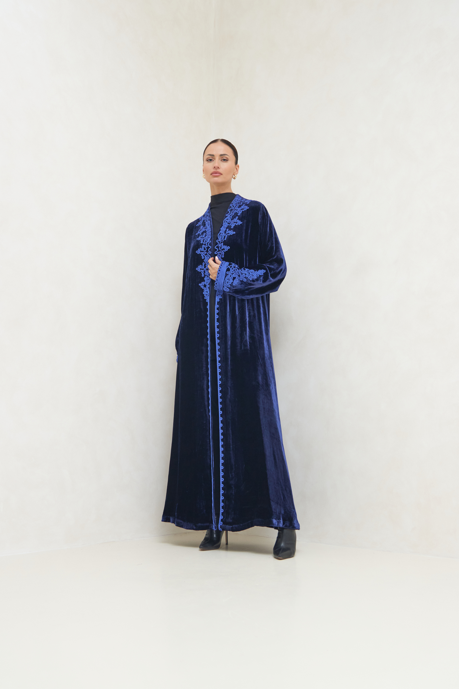 A luxurious abaya crafted from premium velvet silk, designed with elegant Moroccan-inspired touches. It features authentic hand-embroidered Moroccan craftsmanship, showcasing intricate details that make each piece truly unique and artistically refined.
