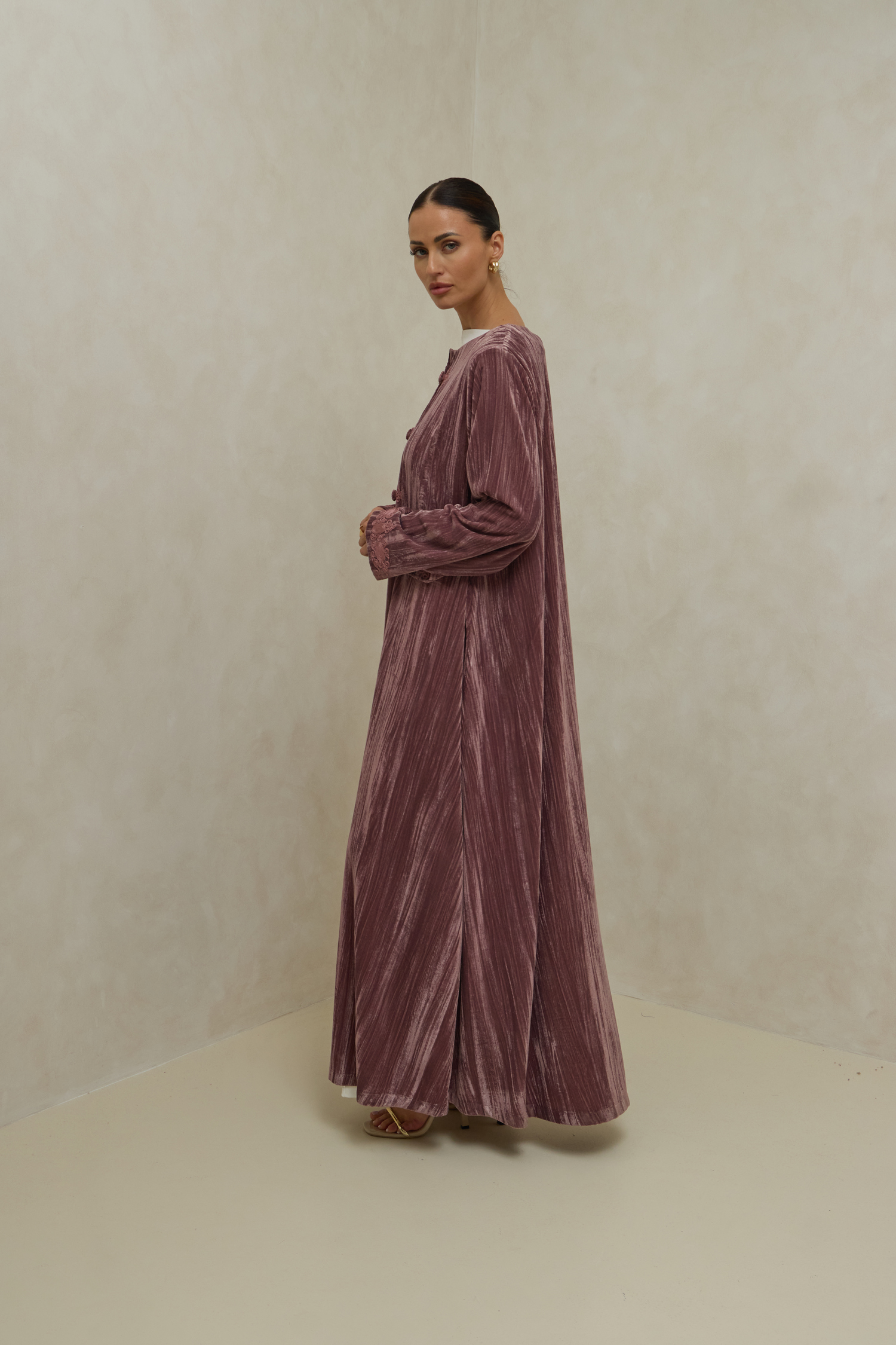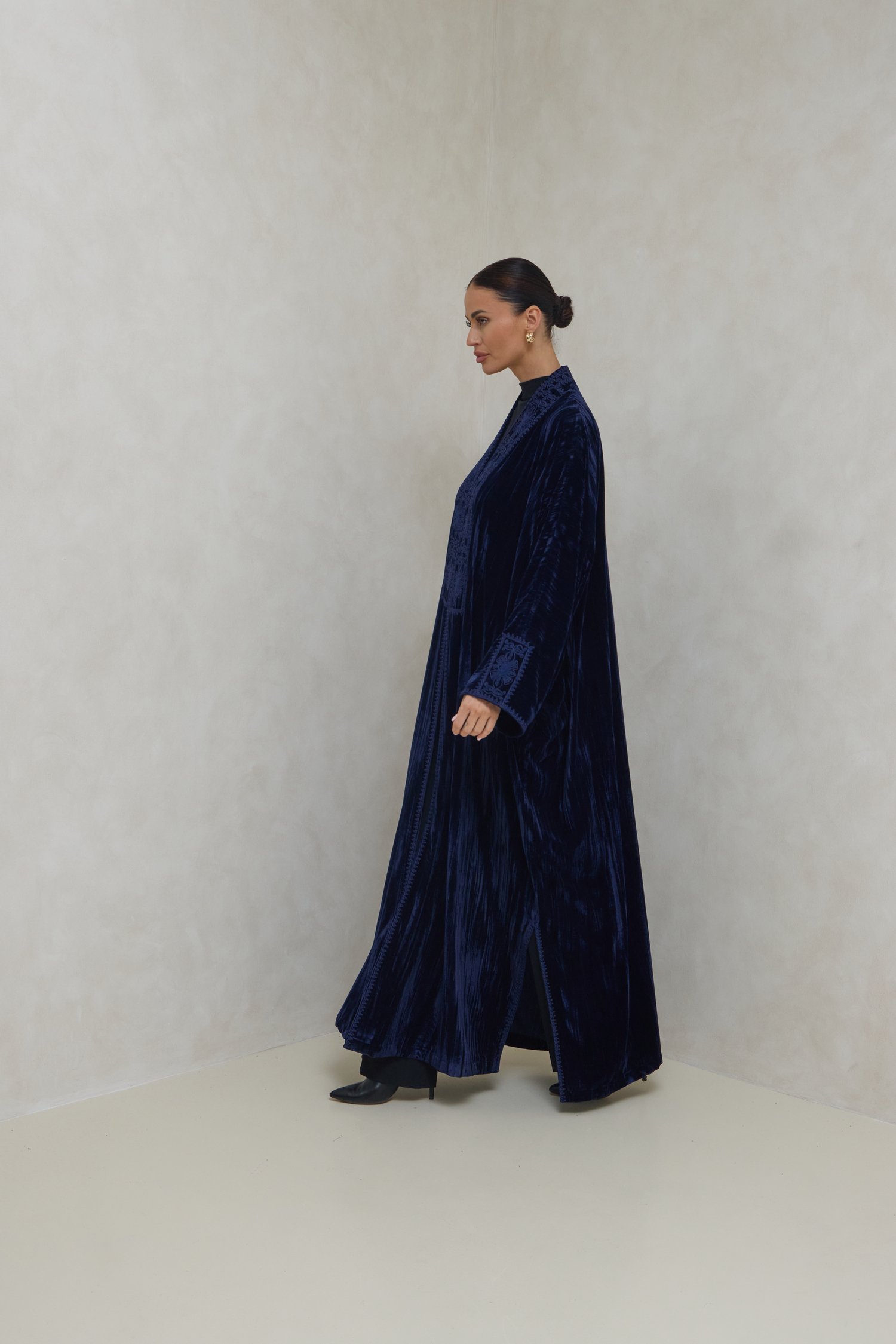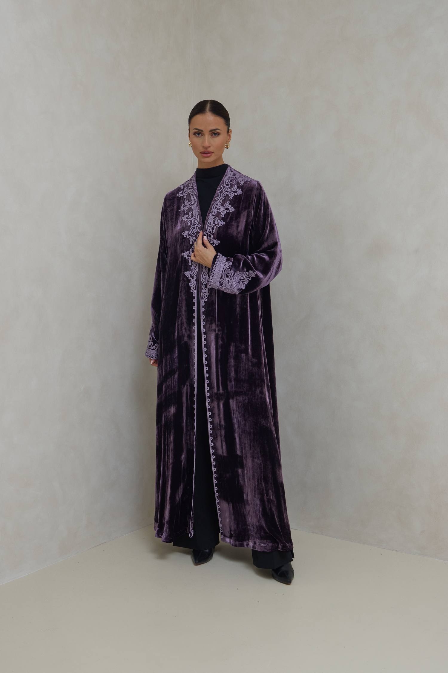 A luxurious abaya crafted from premium velvet silk, designed with elegant Moroccan-inspired touches. It features authentic hand-embroidered Moroccan craftsmanship, showcasing intricate details that make each piece truly unique and artistically refined.