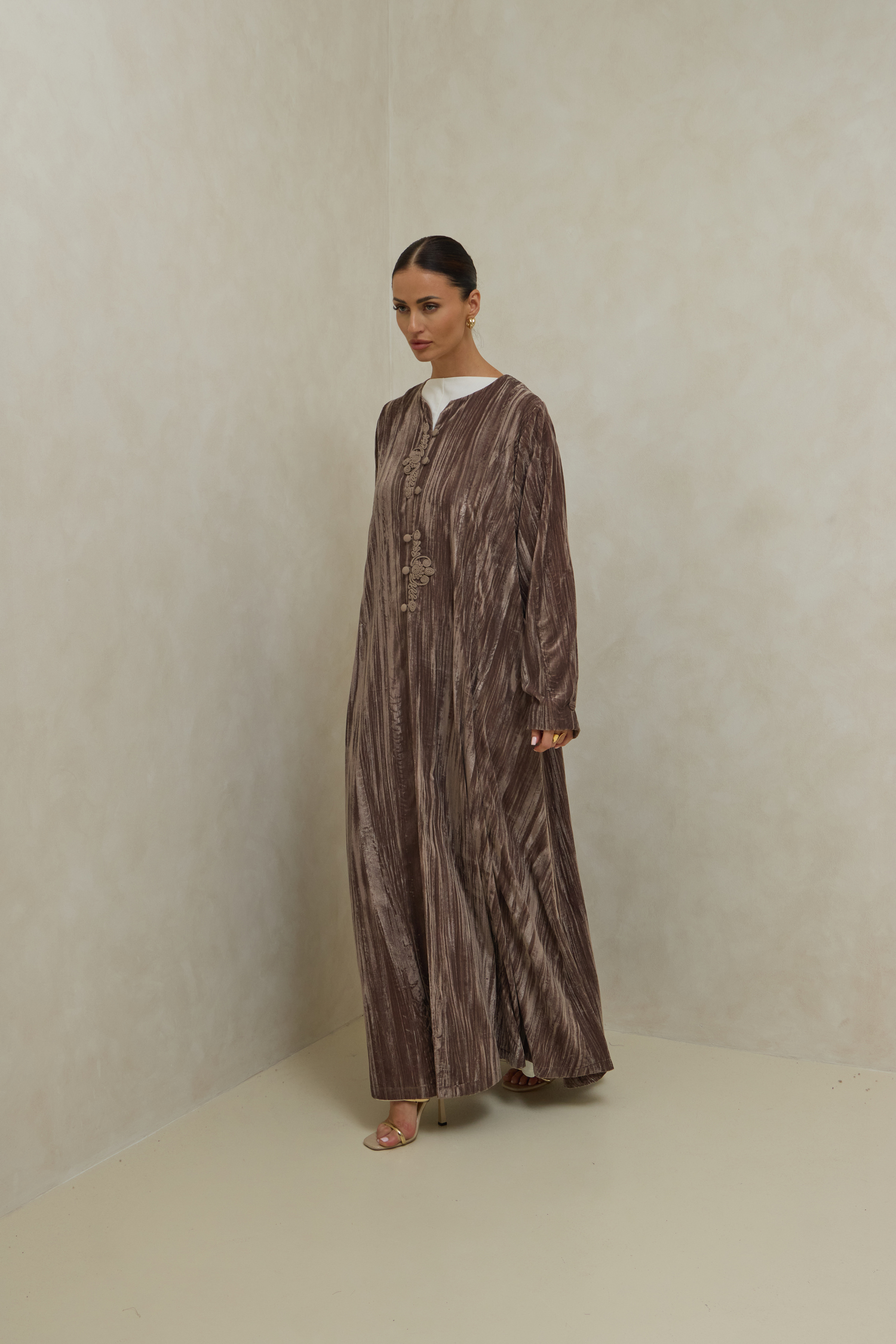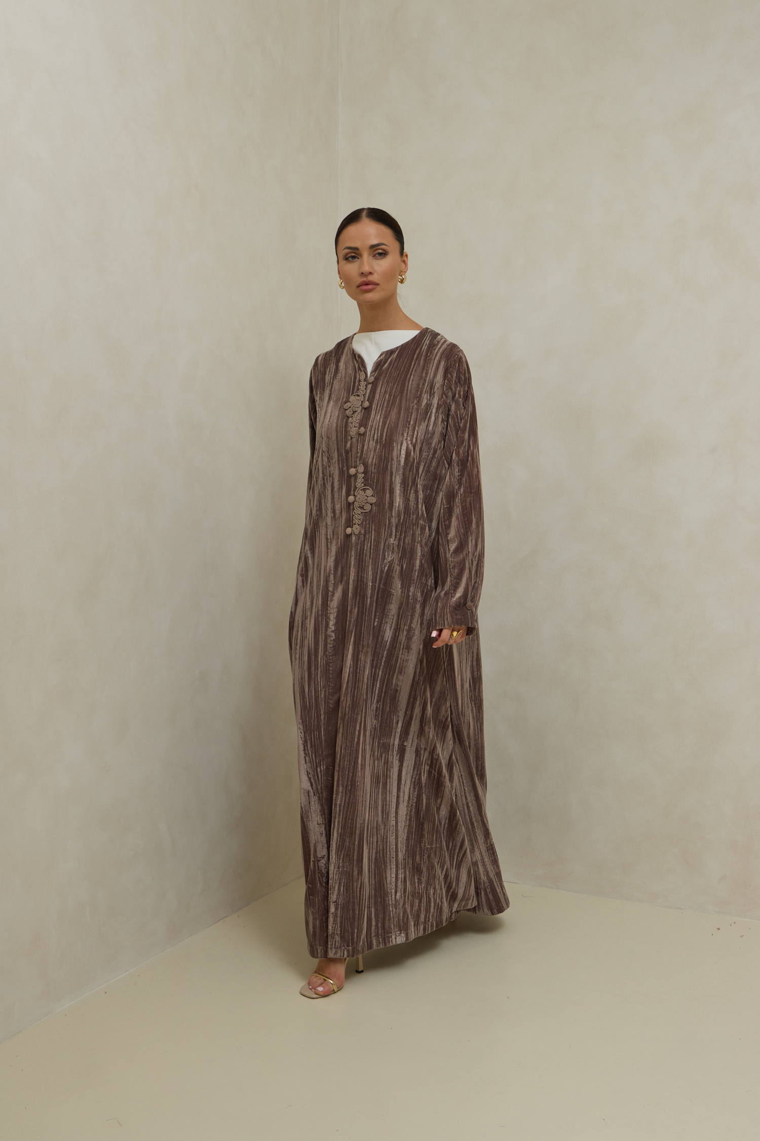An elegant velvet abaya, crafted from soft velvet with subtle shimmering lines that add luxury and fluidity to the design. The front is adorned with handcrafted Moroccan-style decorative buttons, giving the abaya a refined traditional touch that balances simplicity and sophistication.