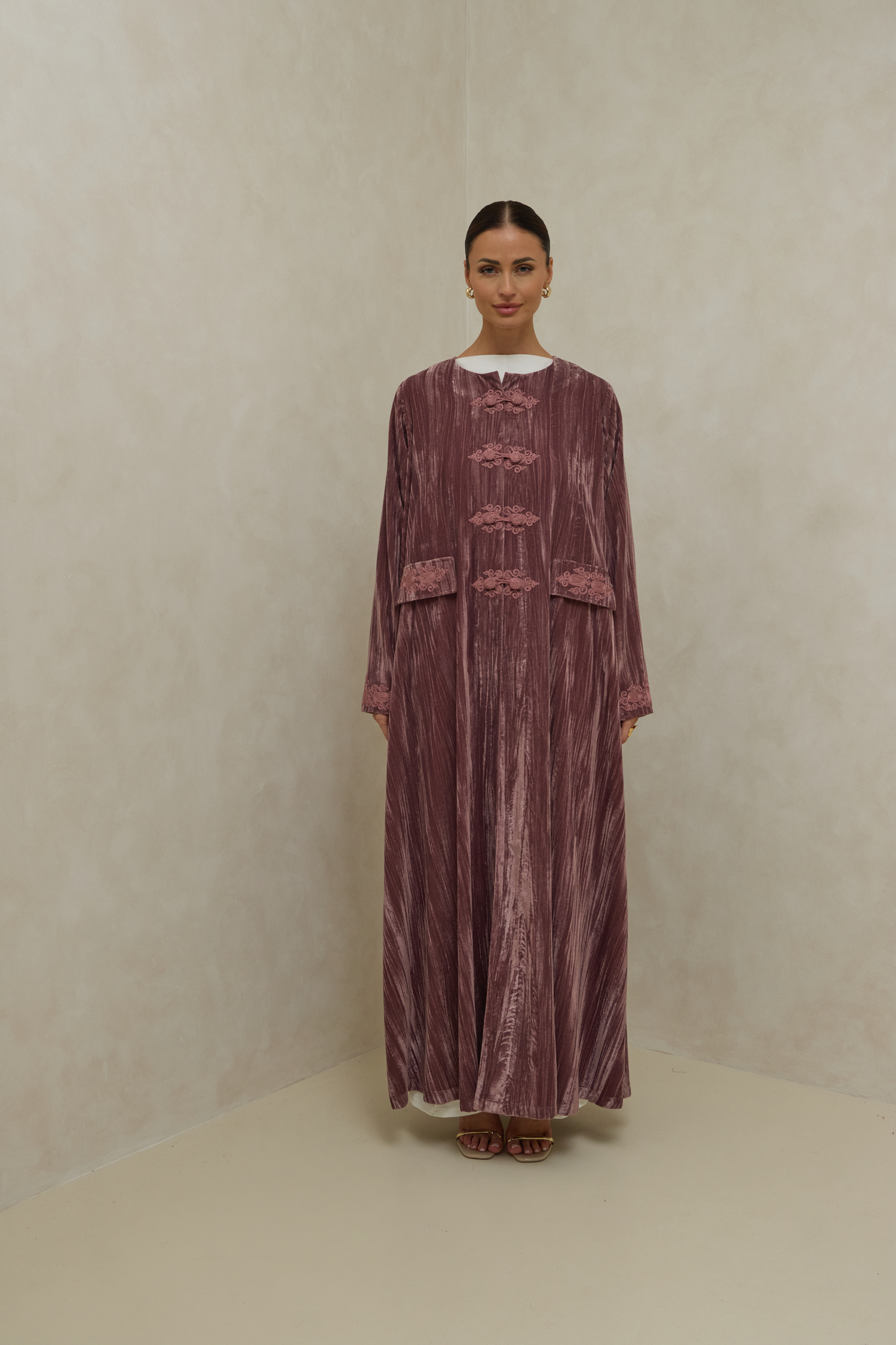 An elegant velvet abaya, crafted from soft velvet with subtle shimmering lines that add luxury and fluidity to the design. The front is adorned with handcrafted Moroccan-style decorative buttons, giving the abaya a refined traditional touch that balances simplicity and sophistication.