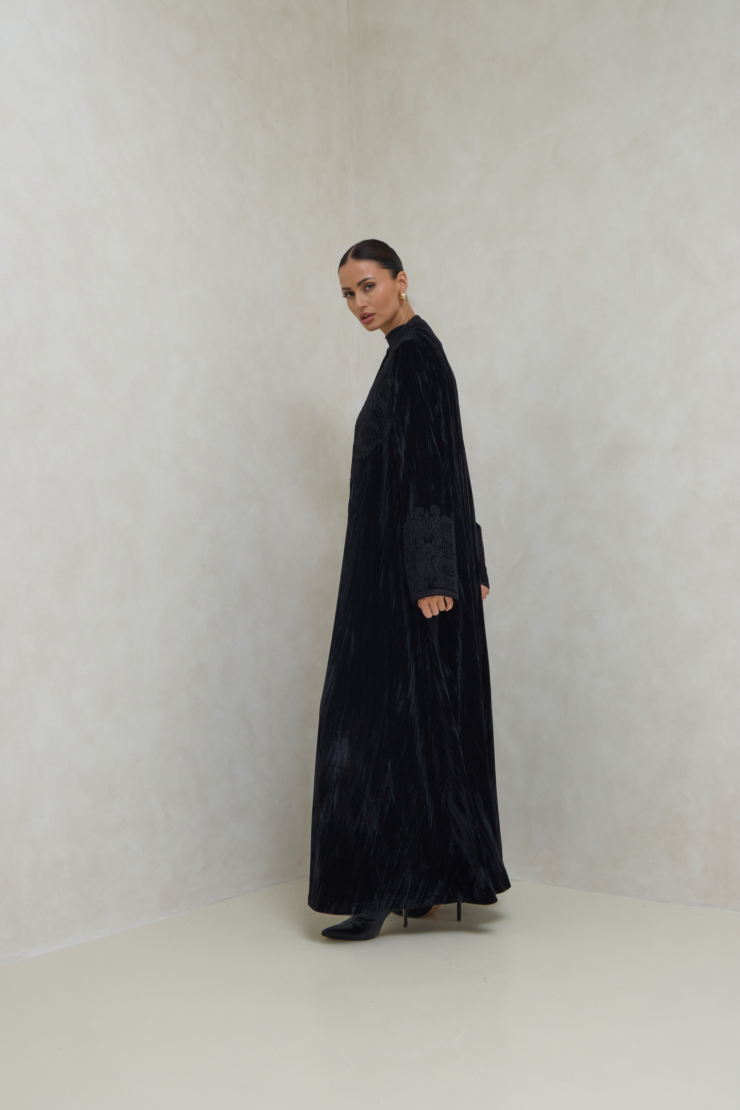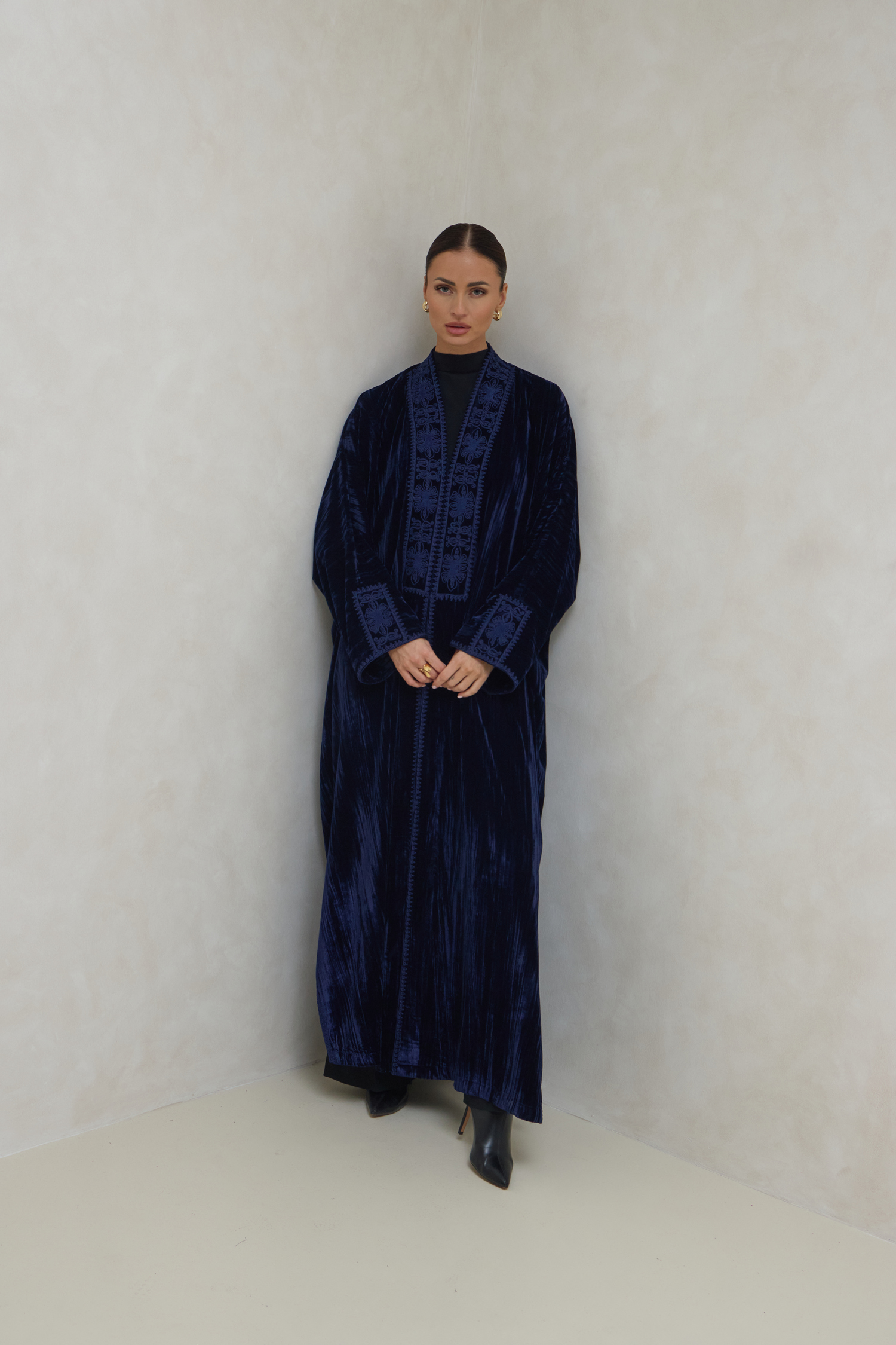 Stand out with a luxurious and elegant look in this soft velvet abaya, adorned with exquisite hand embroidery on the front and sleeves, combining authentic Moroccan craftsmanship with elegant Arabic embroidery. Its design blends luxury and comfort, giving you a distinctive look for any occasion.