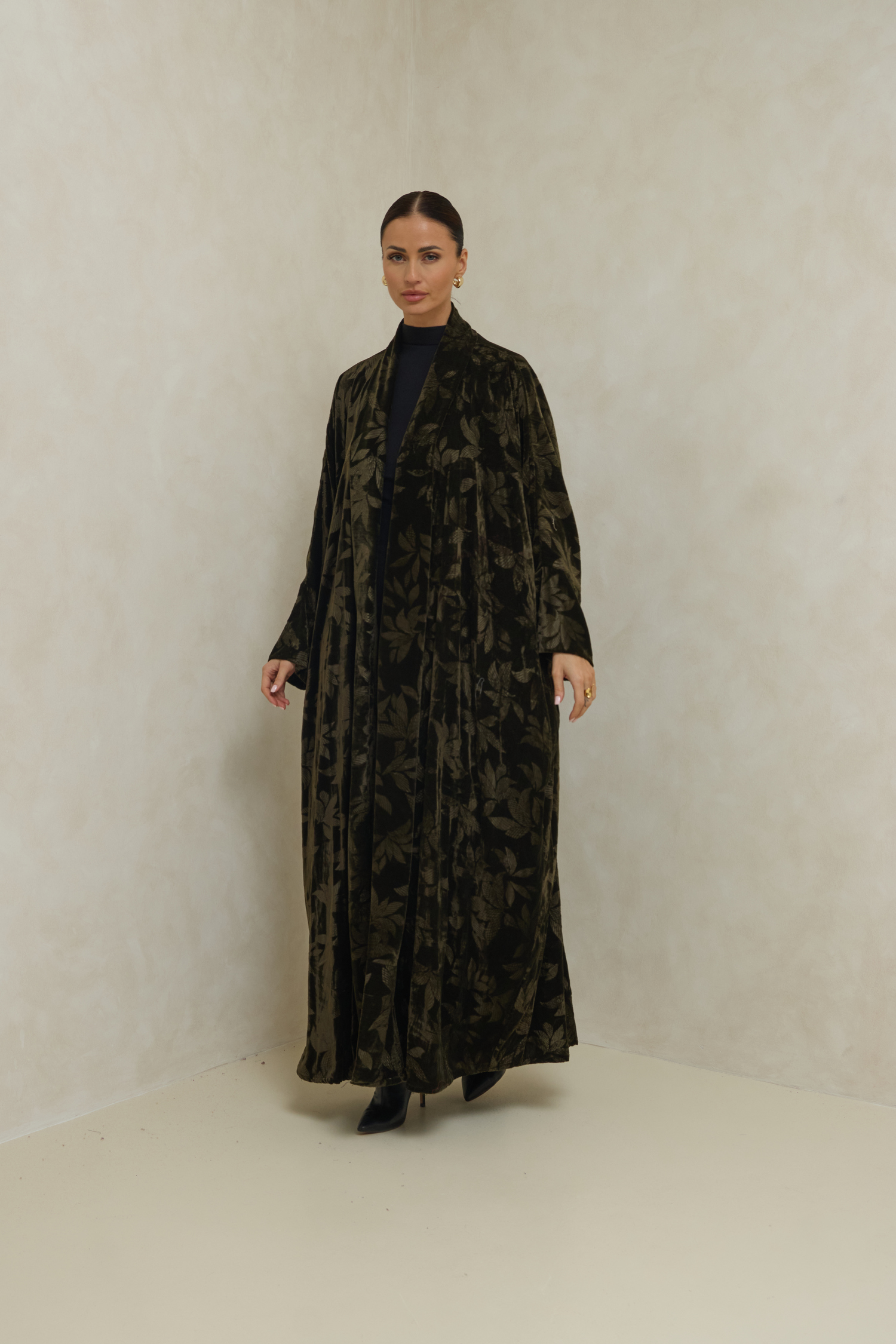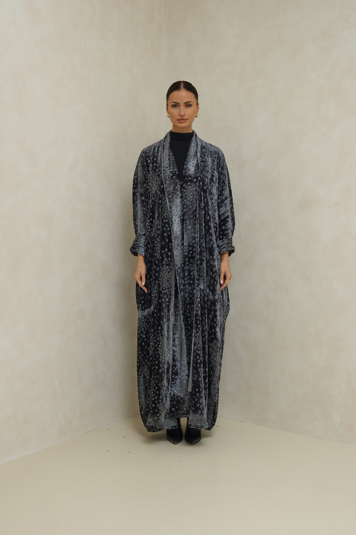 تميزي بإطلالة جذابة مع هذه العباية المخملية من الحرير، المزينة بنقوش دائرية عصرية تمنحك مظهراً أنيقاً وفاخراً. ناعمة، فاخرة، وعصرية – مثالية للمناسبات الخاصة أو لإطلالة يومية راقية.