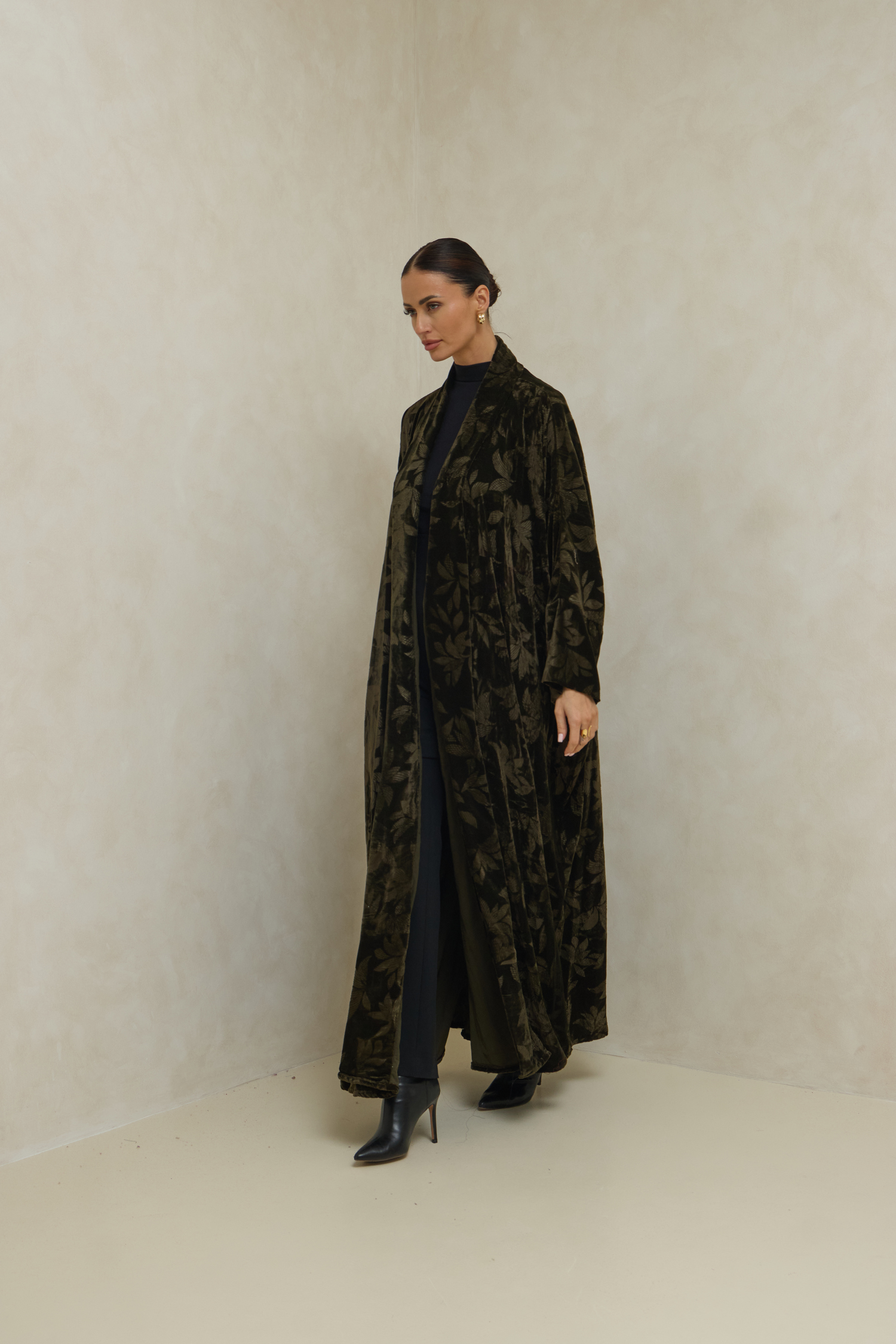 “Stand out with a natural and luxurious look in this velvet silk abaya, adorned with leaf patterns covering the entire garment. Soft, elegant, and contemporary – perfect for special occasions or a chic everyday look.”