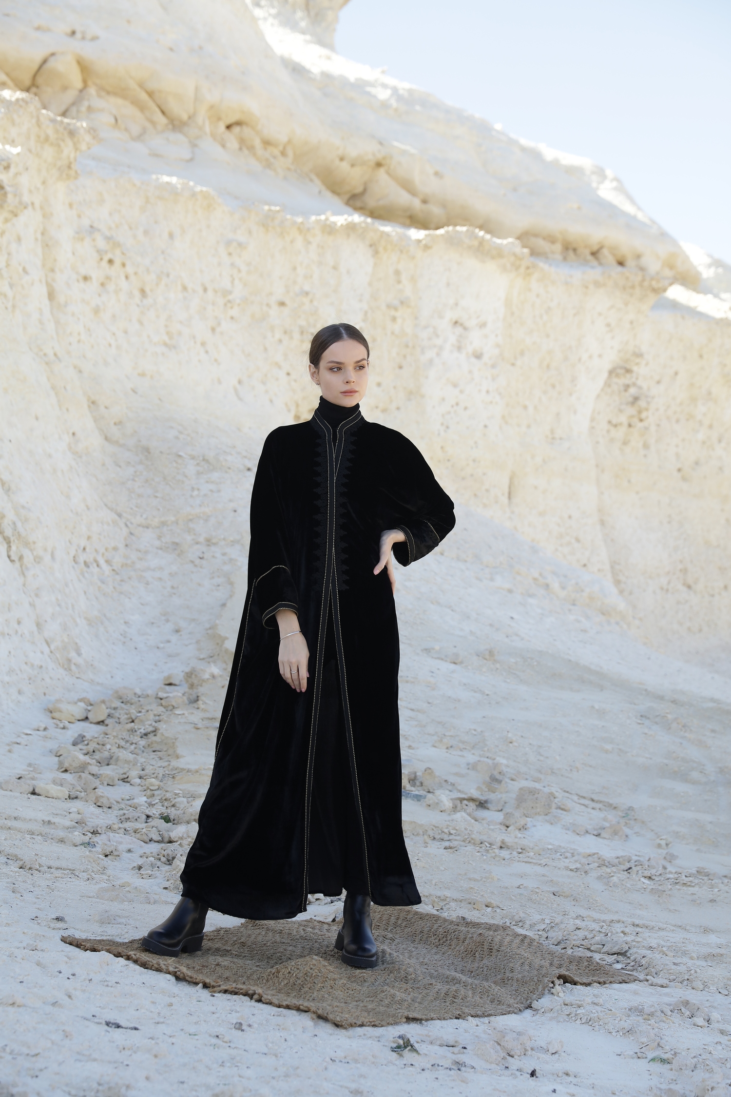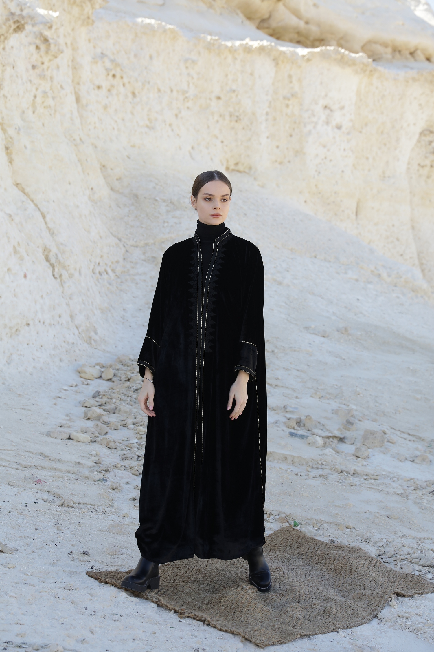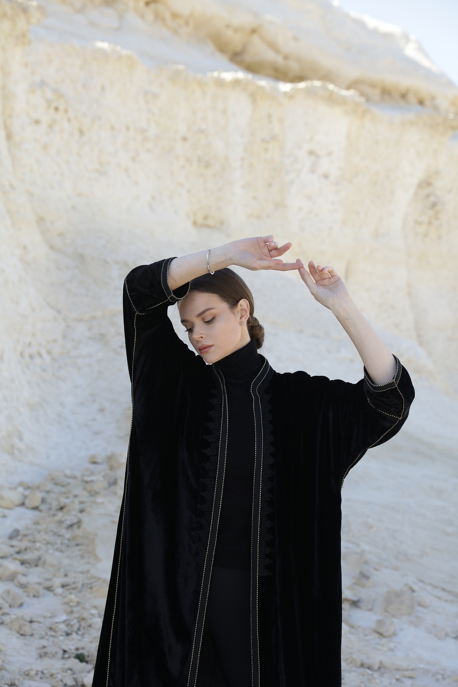 BHD 90.000Abaya of warm Italian velvet fabric made of luxurious silk threads – wide and open design, with narrow sleeves, elegant in wear that expresses your elegance. Comes with a headscarf