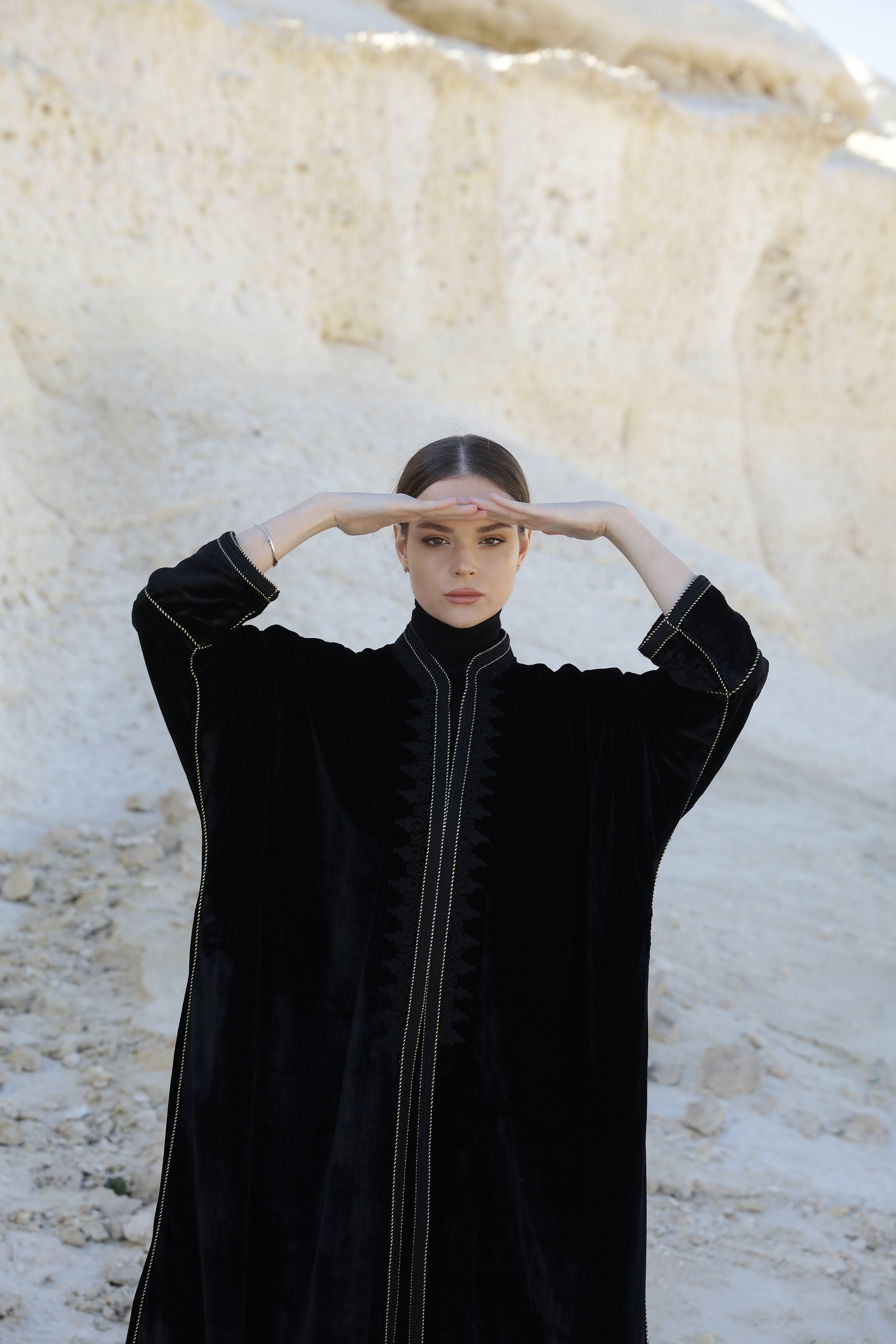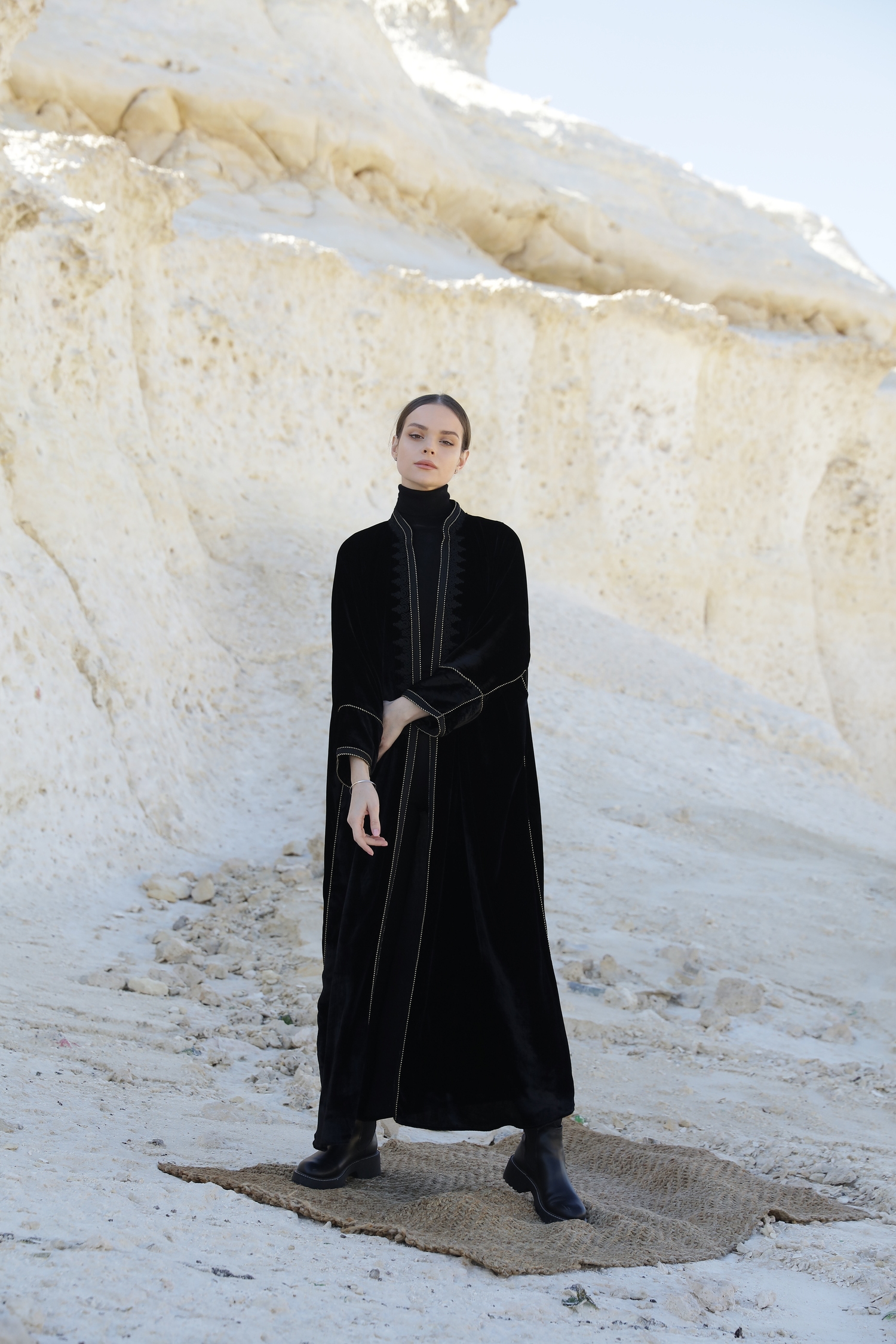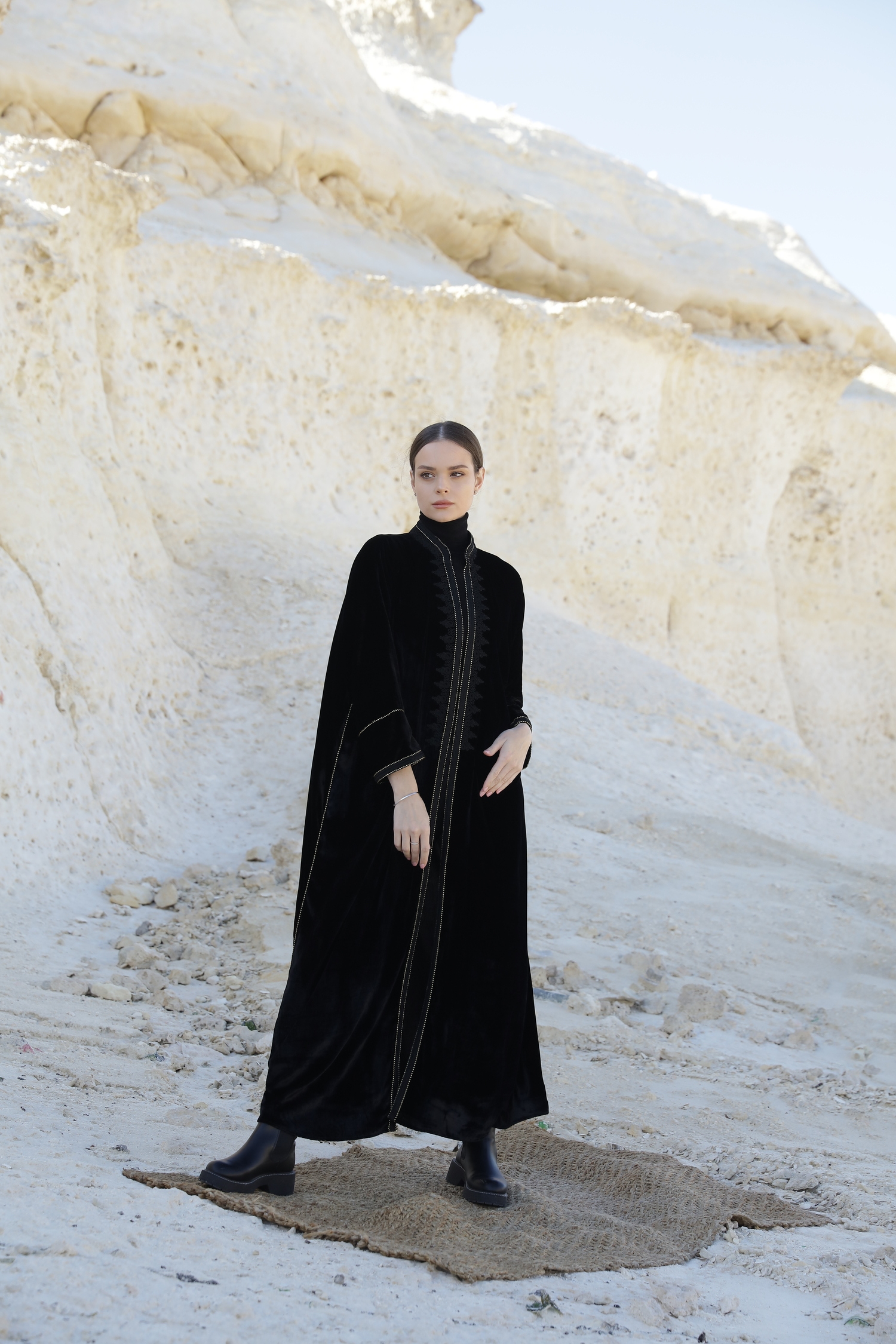 BHD 90.000Abaya of warm Italian velvet fabric made of luxurious silk threads – wide and open design, with narrow sleeves, elegant in wear that expresses your elegance. Comes with a headscarf