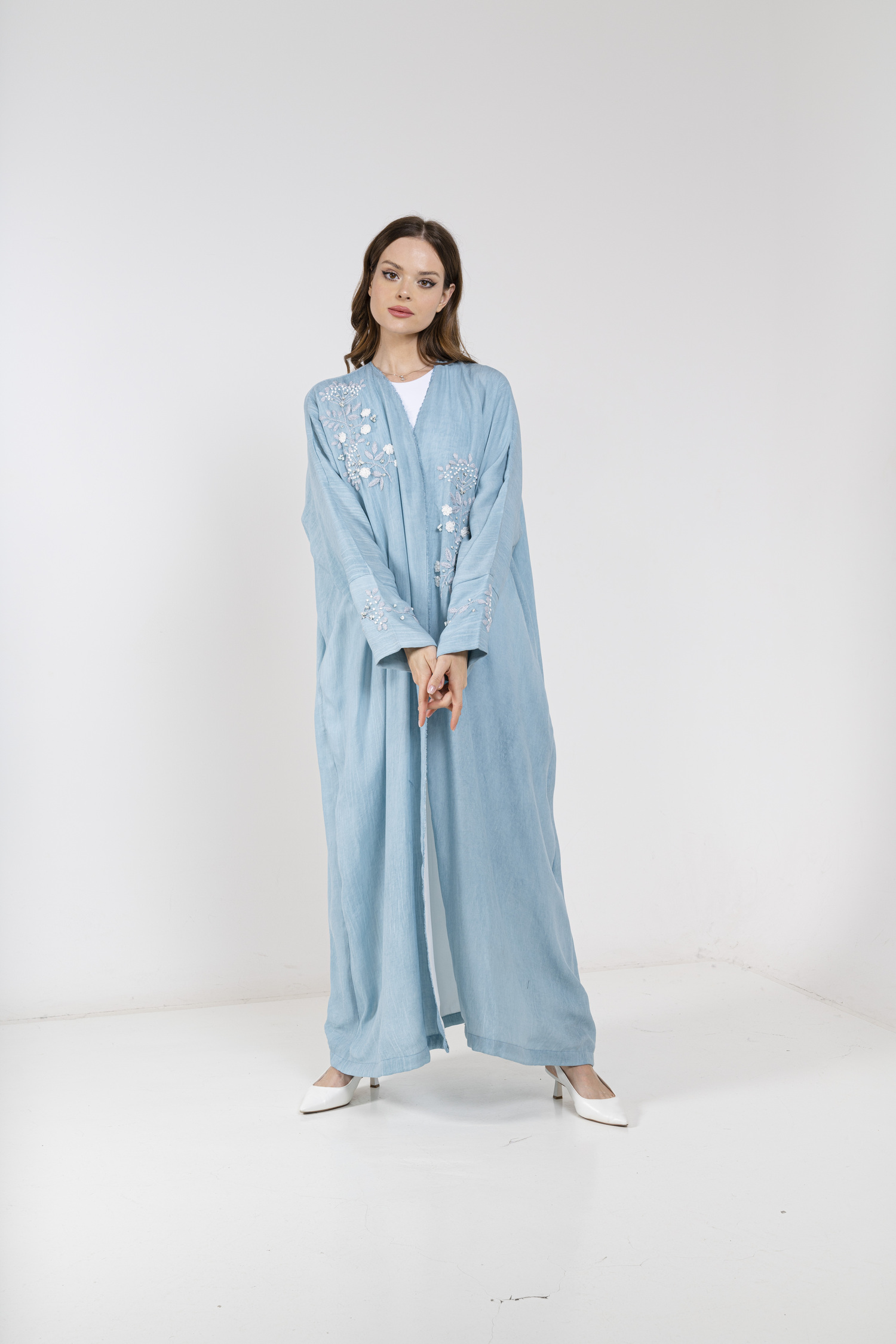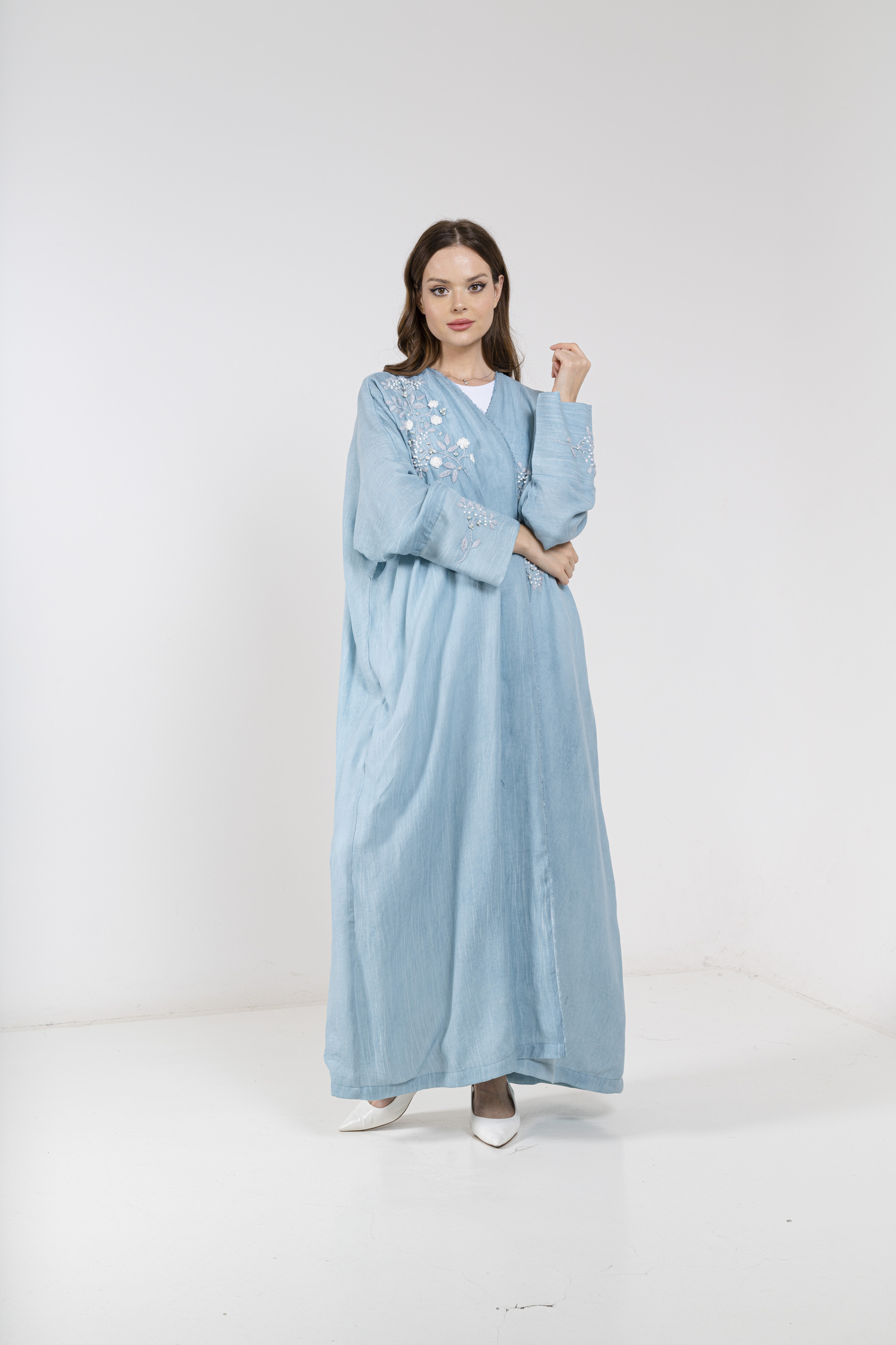 BHD 130.000Sophisticated Occasional Abaya, Flower cascade in the shoulder front and back with light matching scarf