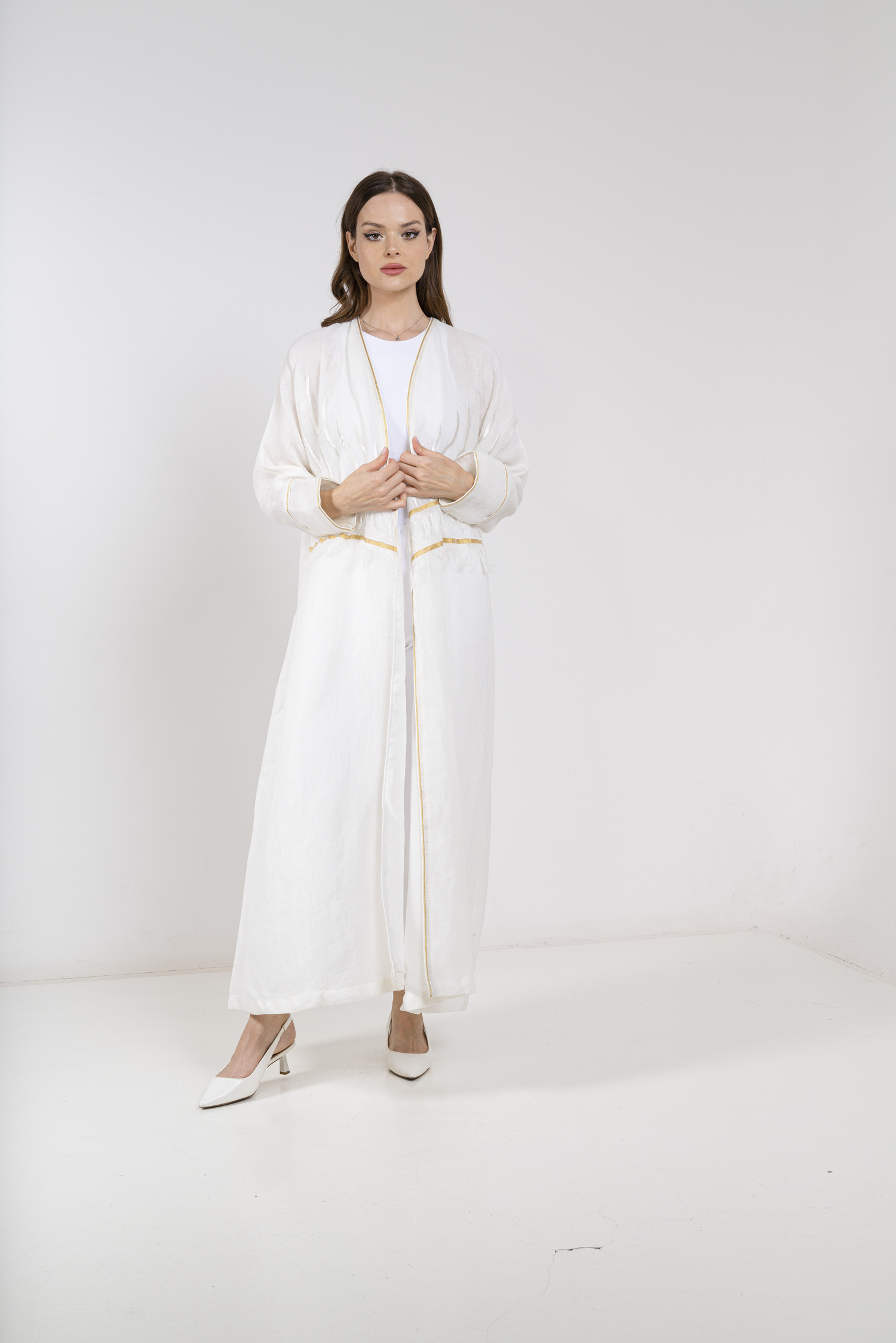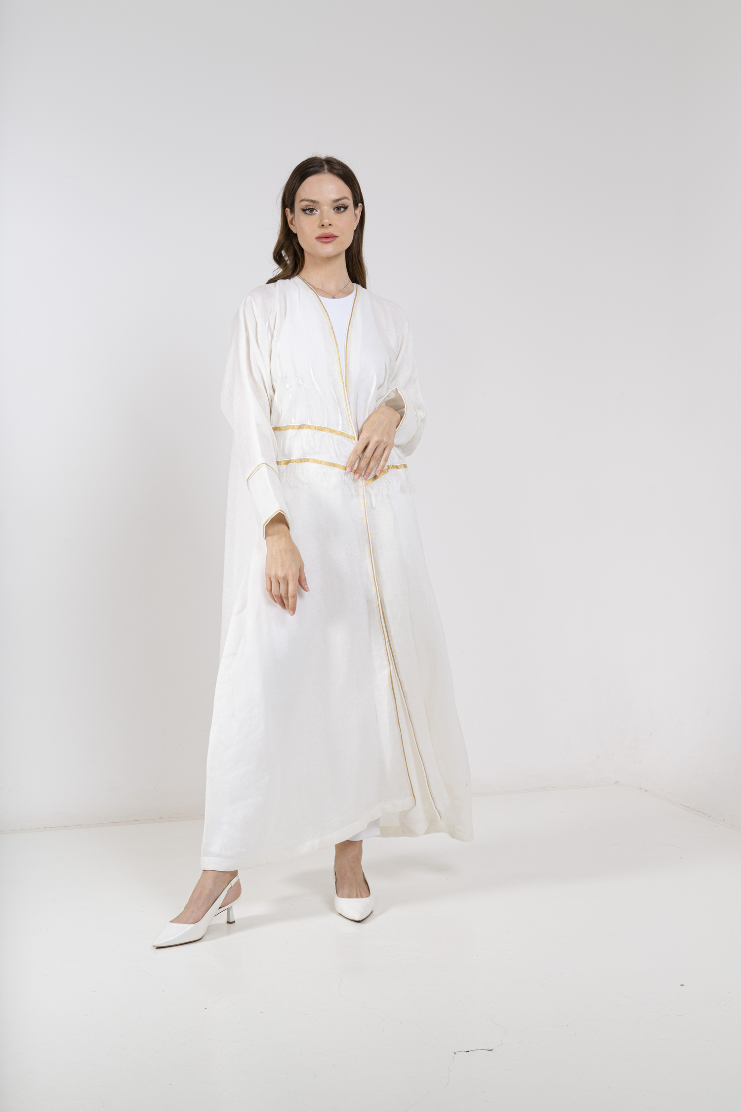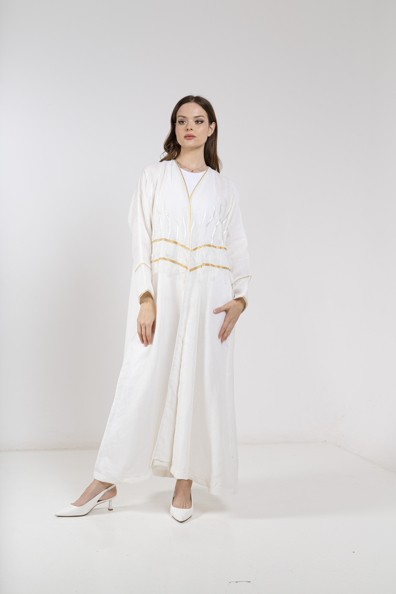 BHD 130.000Beige Linen Abaya With Handwork Embroidery Details From Shoulders Till Waist With Lining