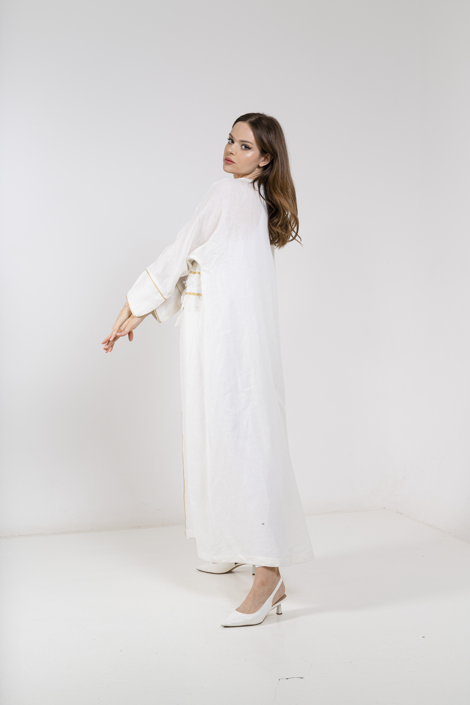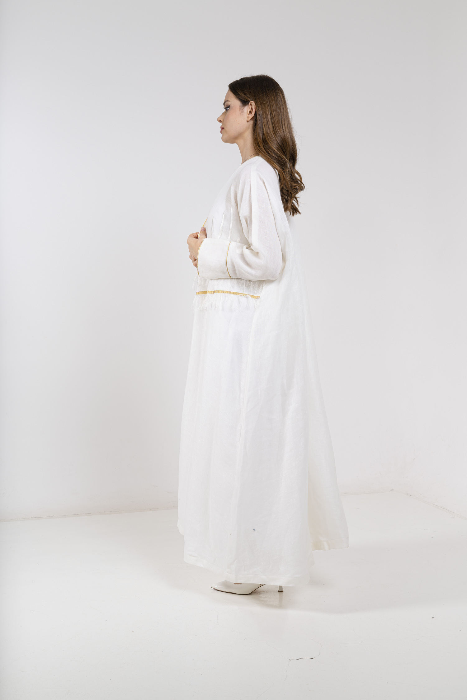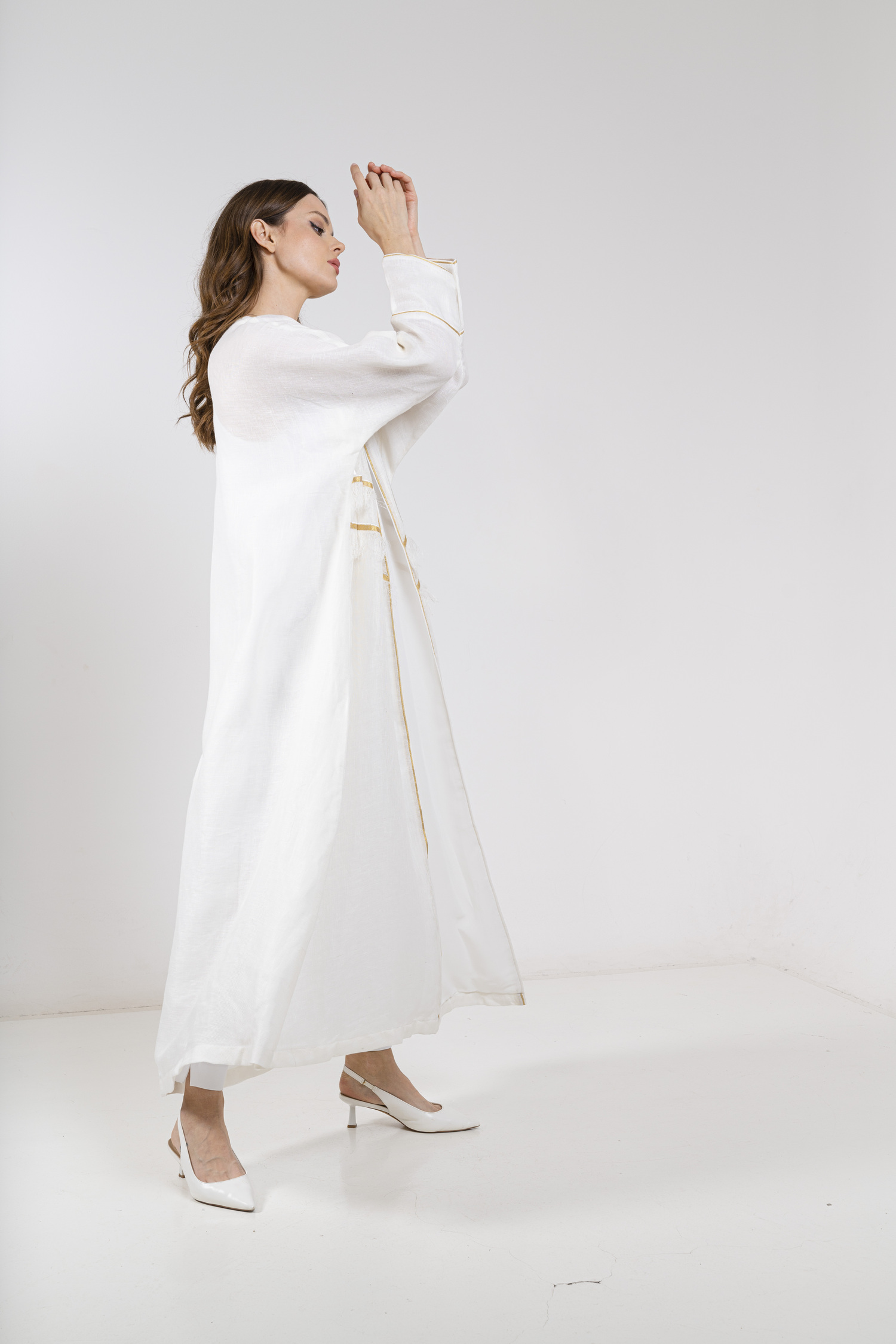 BHD 130.000Beige Linen Abaya With Handwork Embroidery Details From Shoulders Till Waist With Lining