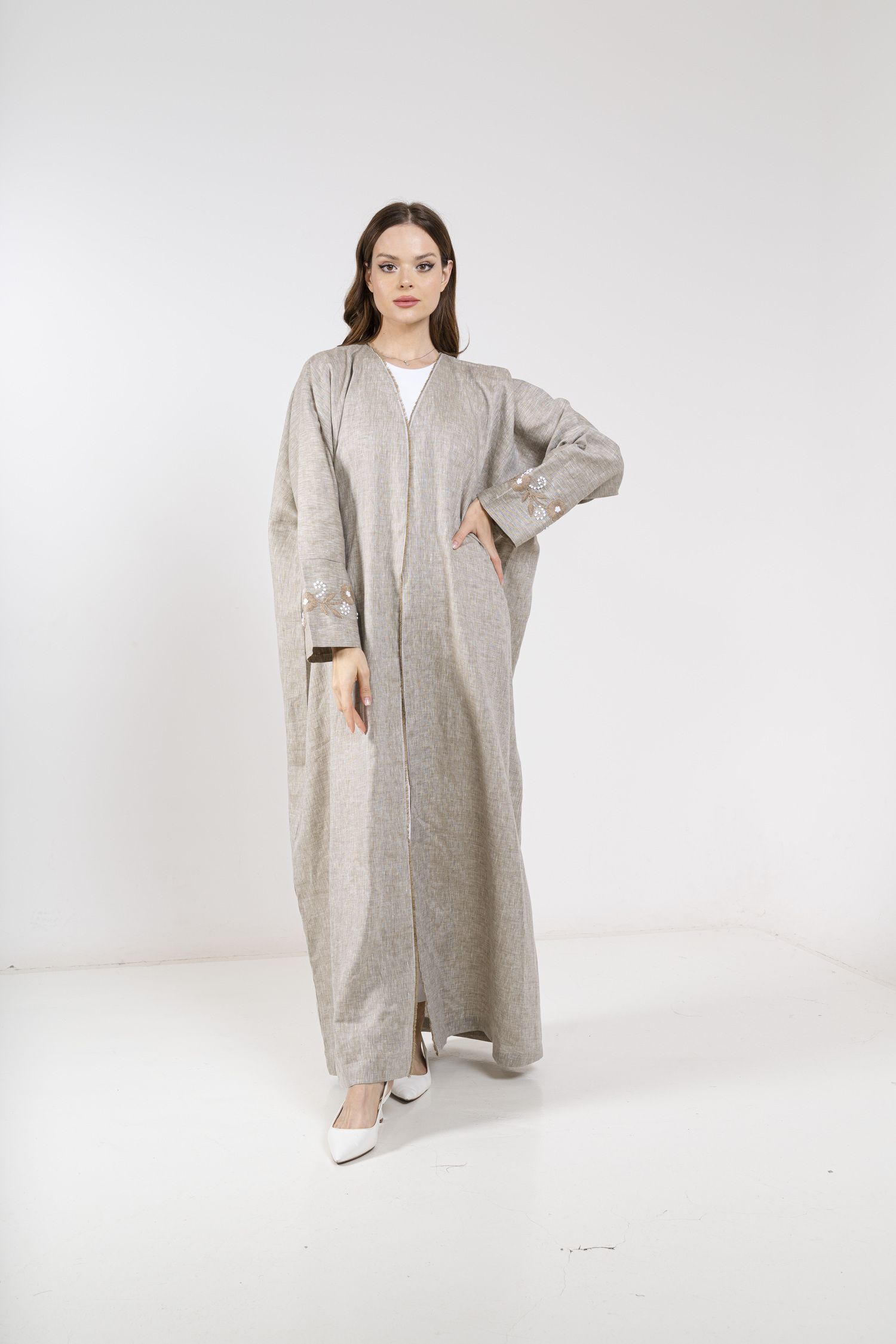 Linen abaya with Handmade embroidery, it come with Light brown Scarfes