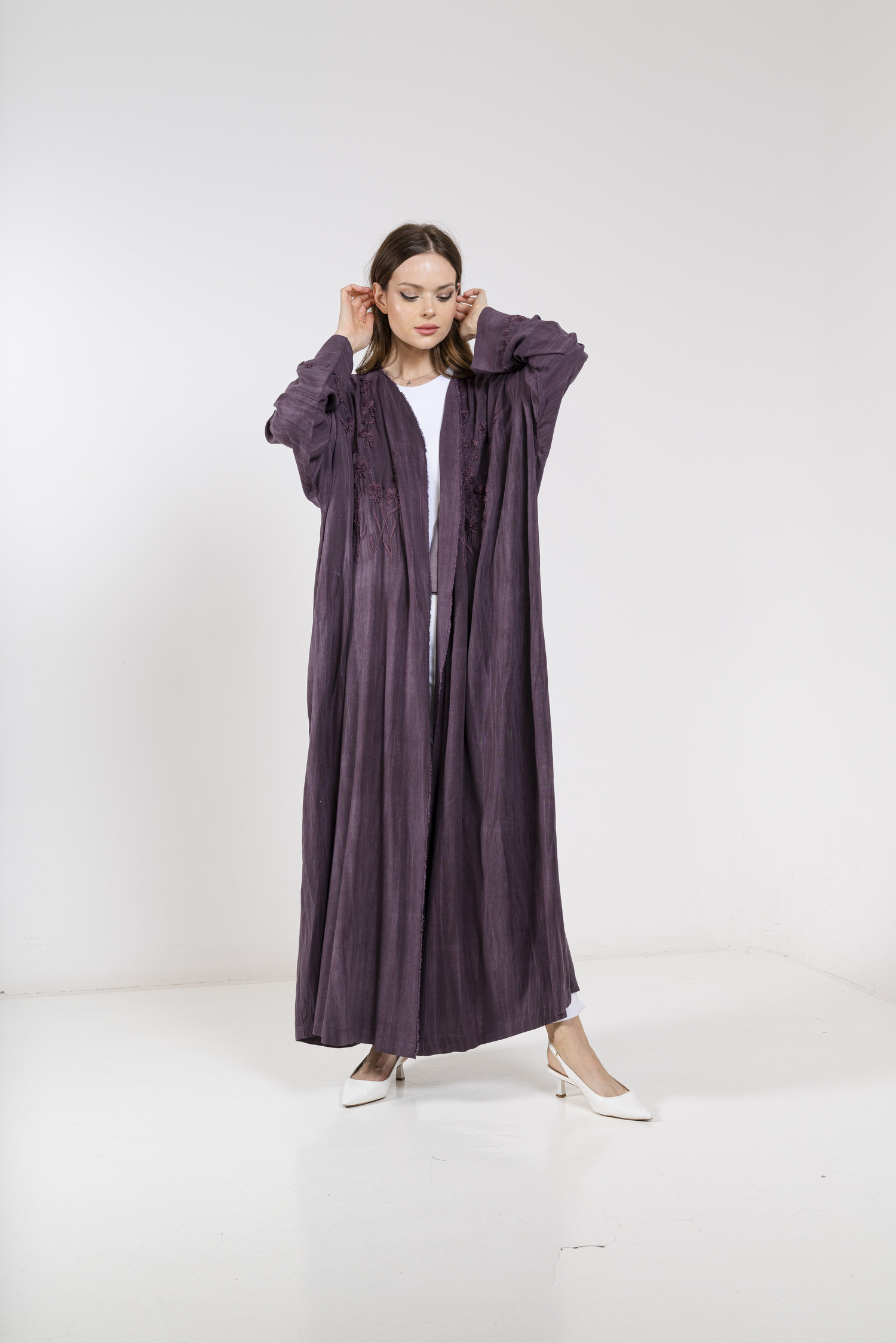 Linen abaya with Handmade embroidery, it come with Purple Scarfs
