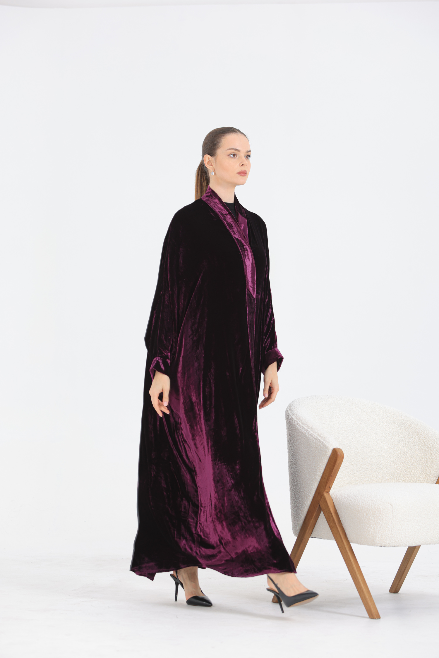 Abaya of warm Italian velvet fabric made of luxurious silk threads – wide and open design, with narrow sleeves, elegant in wear that expresses your elegance. Comes with a headscarf