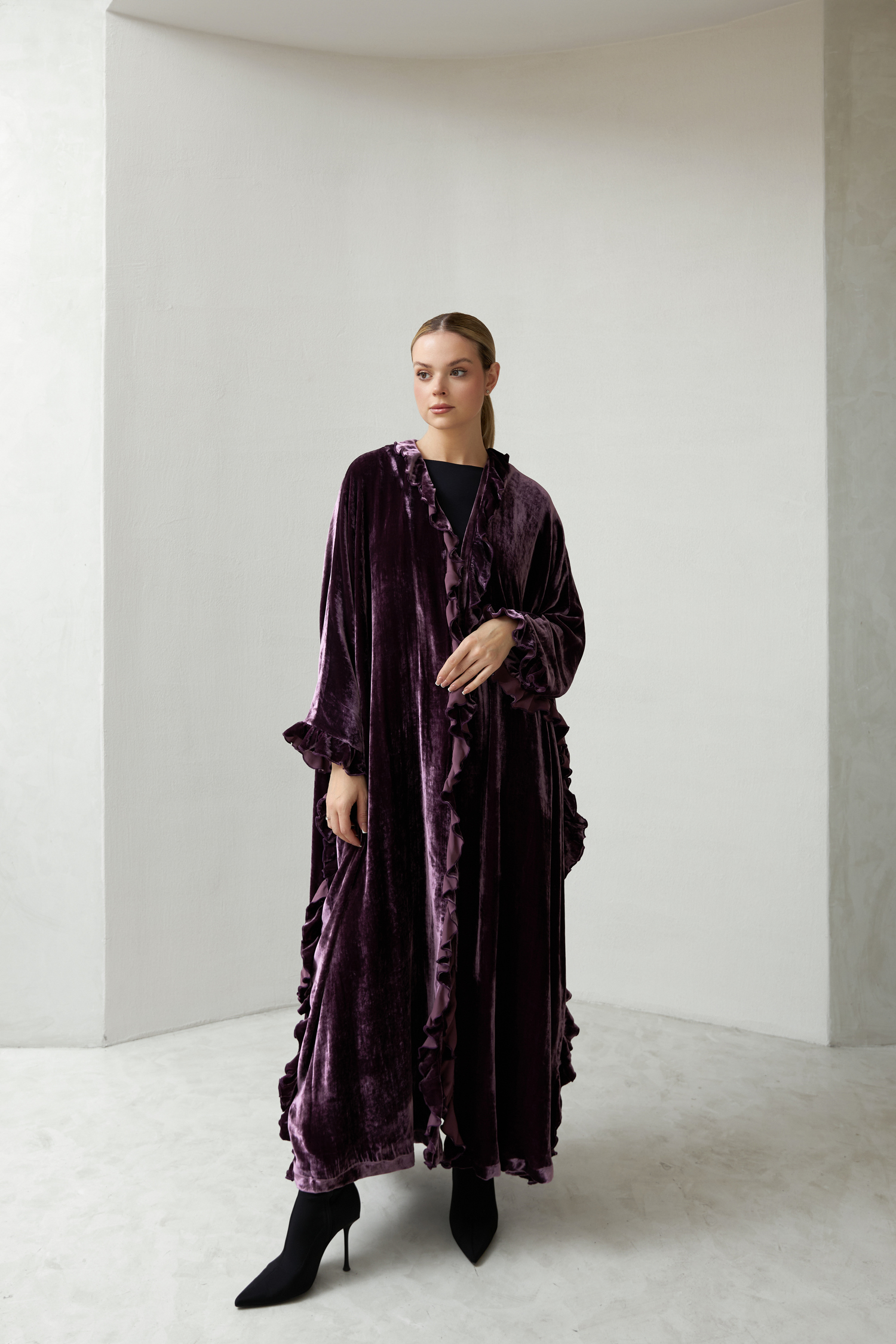 Purple ruffle velvet abaya with lining, Free Size Cut