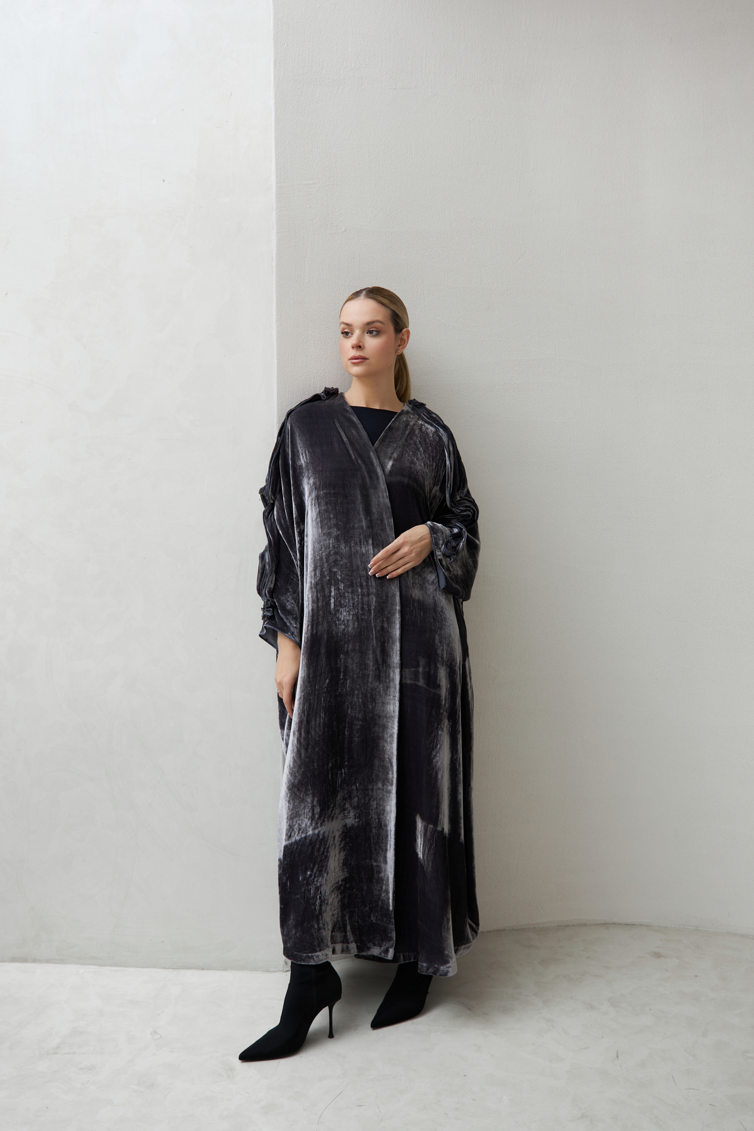 Gray ruffle velvet abaya on the sleeves with lining, Free Size Cut